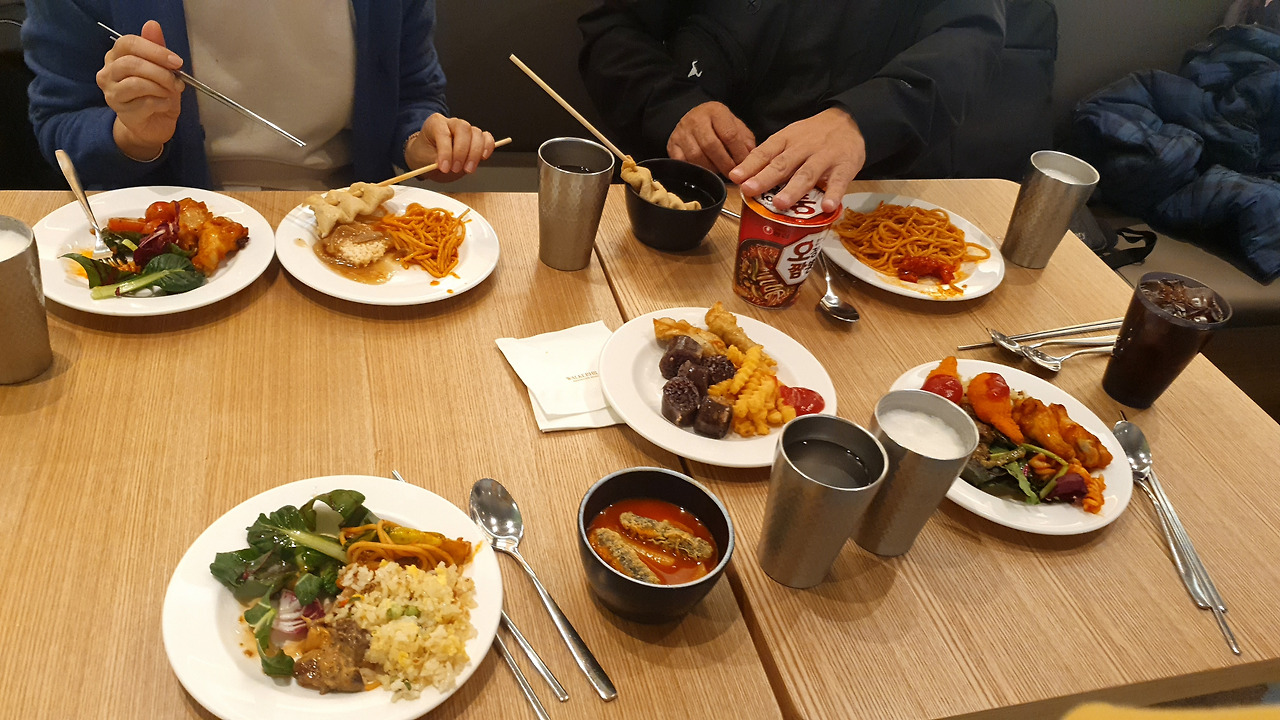 마침내 짐을 들여보내고 손이 자유로워진 우리 가족은 라운지에 가서 끼니를 해결하기로 했다. 미리 사둔 쿠폰으로 허기졌던 배를 채웠다. 오뎅국물과 떡볶이 그리고 맥주를 곁들이니 이미 만족스럽다.