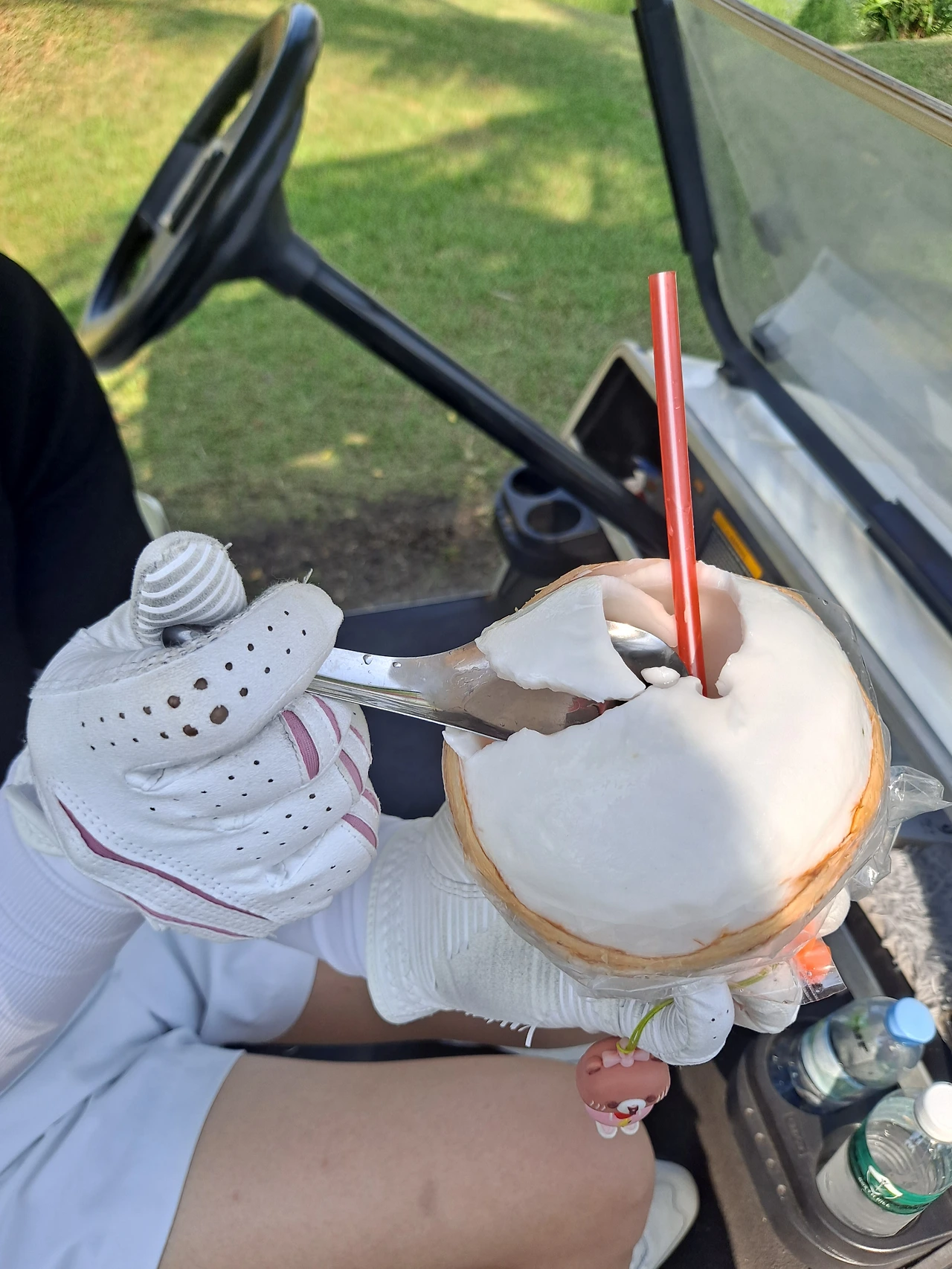 함께한 지 이틀 째. 매 홀마다 애써 실망을 감추고 다음 공략에 나서는 캐디님께 더 나은 모습을 보이고 싶다는 의지에 불탔고 그러는 동안 '실전 감각'이 조금씩 발전해갔다. 점수로 보여주지 못해 아쉽던 찰나, 갑자기 다가 따로 챙겨 온 아이스백을 주섬주섬 뒤지기 시작했다. 투명비닐로 정성스레 포장한 탐스러운 코코넛 4개가나왔다.