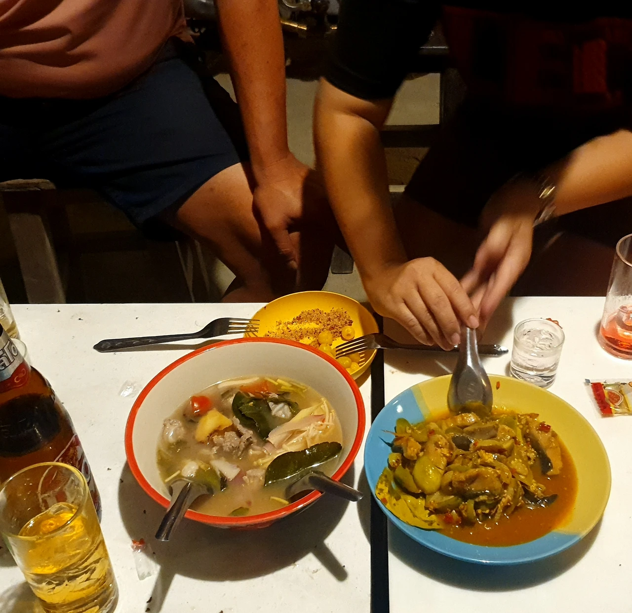 우리가 태국음식을 잘 먹는 모습이 보기 좋았는지, 니우는 점점 더 낯설고 어려운 음식들을 권했다. 민물게 내장을 밥에 얹어 직접 먹여주기에 눈 딱 감고 맛보았는데 고소함과 짭조름함의 조화가 좋았던 적도 있고, 메기가 들어간 '똠얌'과 맵고 시고 단, '똠샙'이라는 국을 사주기도 했다. '김치찌개와 청국장 맛을 알려주고 싶은 한국인 마음'과 같겠거니 하며 최대한 먹어치우곤 했는데, 일정 난이도 이상이 되니 곤란했다. 신기한 지금 와서 그 시큼 매콤한, 라임향 담긴 국물 맛이 불현듯 떠오를 때가 있다. 먹고 싶을 만큼은 아니어도.