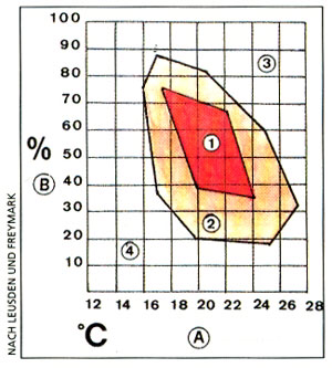 위 그래프는 인간이 쾌적함을 느끼는 온습도에 관한 표 입니다. (1) 내부가 가장 쾌적한 온도와 습도 입니다. 습도는 실내 온도에 따라 적정 습도 구간이 달라집니다. 대략 섭씨 20~22도, 상대습도 50~60% 구간을 유지하는게 가장 이상적이죠.