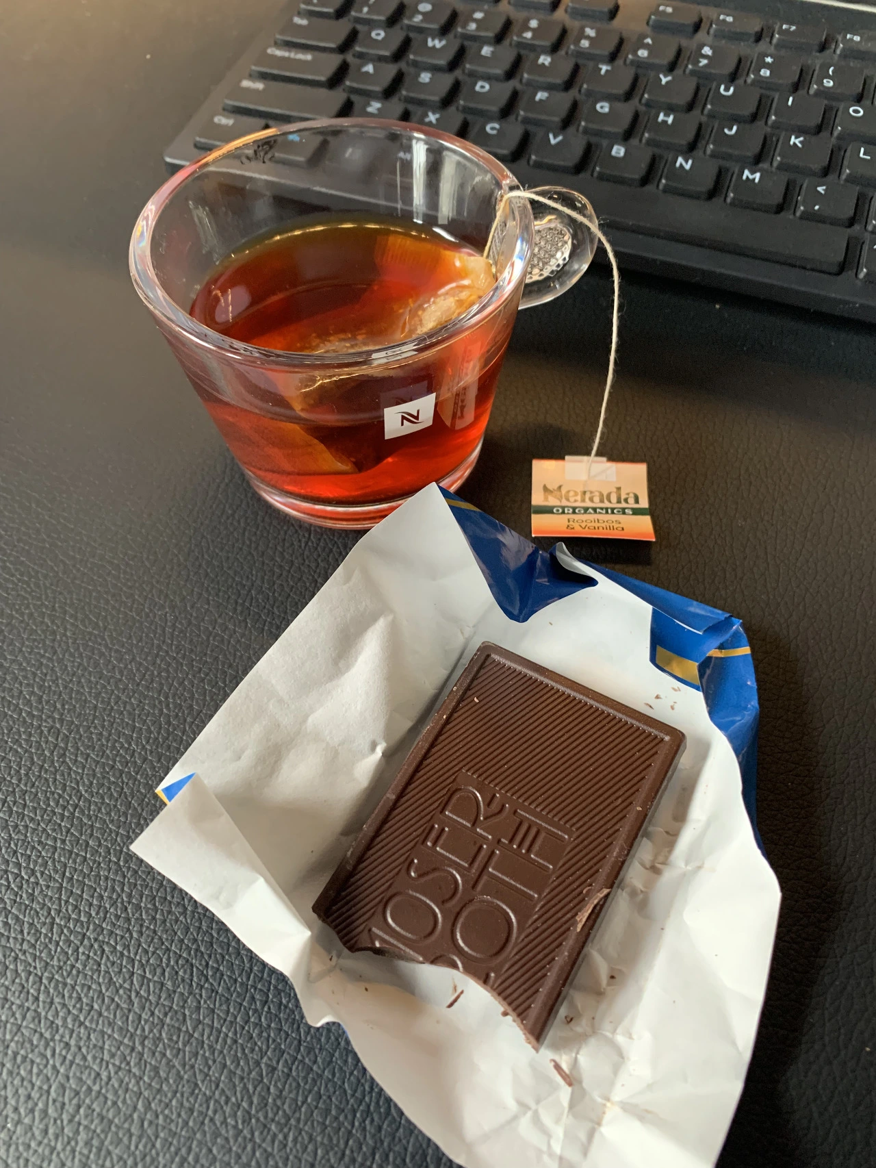회사에서는 커피와 차, 우유(+plant-based)가 무제한 제공된다. 하루에 커피는 두 잔 이상 마시지 않으려고 하고 있어서 보통 오후에는 티를 마신다. 저 초콜릿은 ALDI에서 파는 dairy-free (우유가 함유되지 않은) 비건 초콜릿.