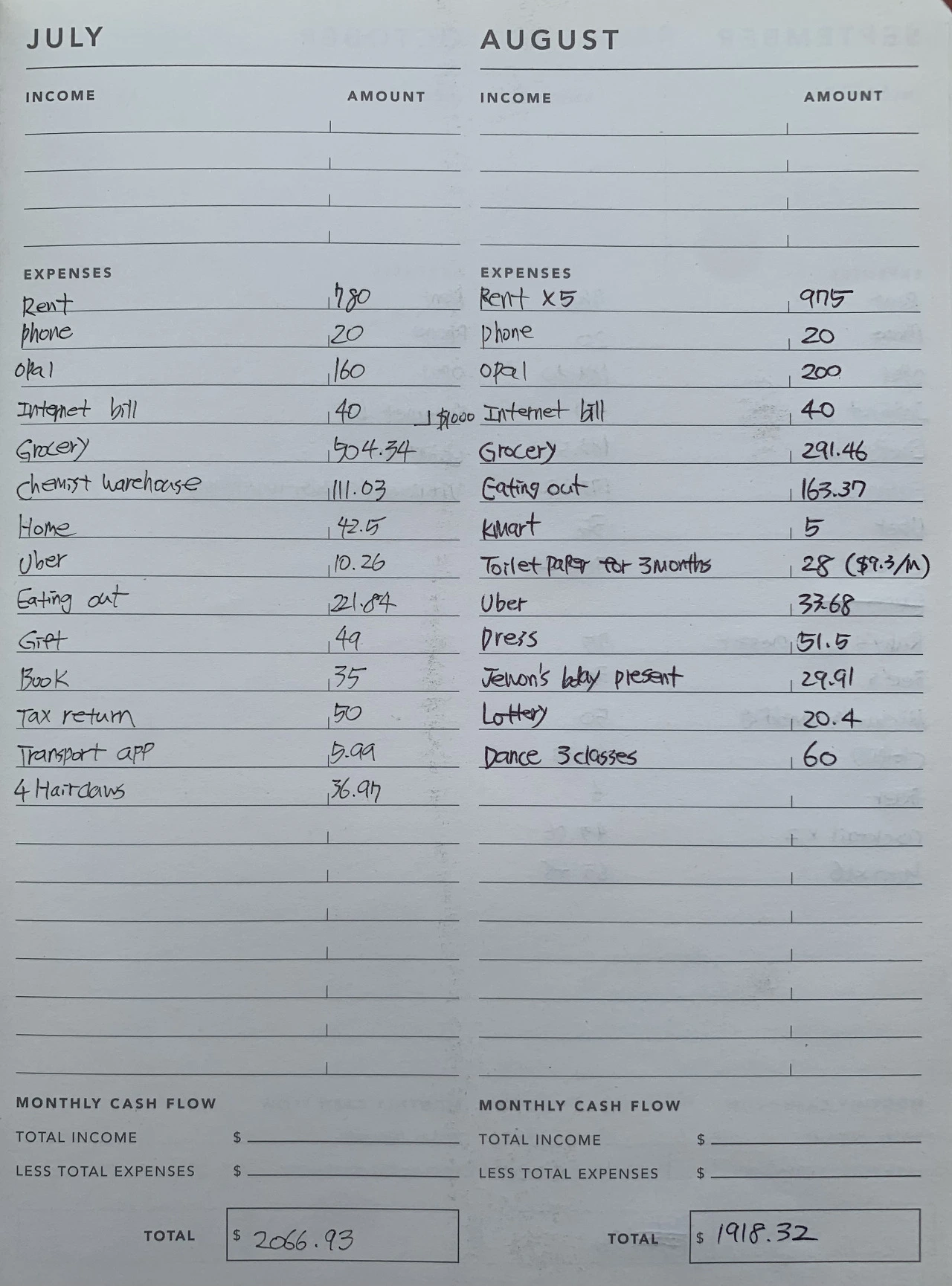 현재 10월이므로 아직 10월은 기록하지 않았다. 항상 총합산을 보기 위해 그 달이 지나고 나서 기록한다. 그러니까 정말 생활비를 줄이는 데에는 도움이 되지 않는 기록방식이다. 생활비를 굳이 줄이겠다는 마음가짐이 전혀 보이지 않는다. 다행히 몸에 밴 생활방식이 검소한 편이라 충동구매나 예쁜 쓰레기를 사모으는 일은 정말 손에 꼽는다.