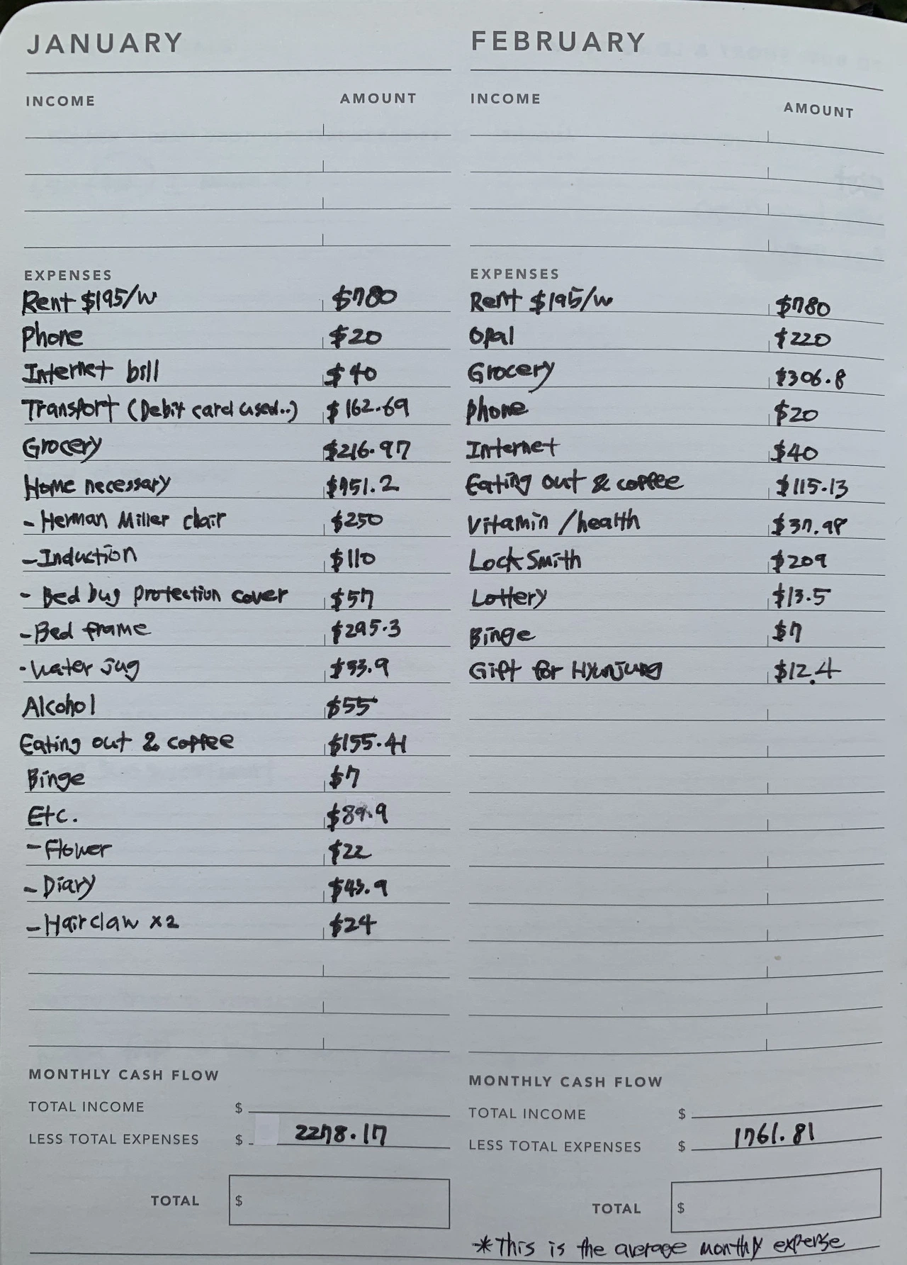 가장 많이 쓴 달은 한국에 가는 티켓을 산 달을 제외하고 $2278(208만 원)로 1월이다. 그러니까 160-210만 원 정도가 풍족하게 부족한 것 없이 먹고 사고 놀고 쓰며 한 달에 나가는 비용.