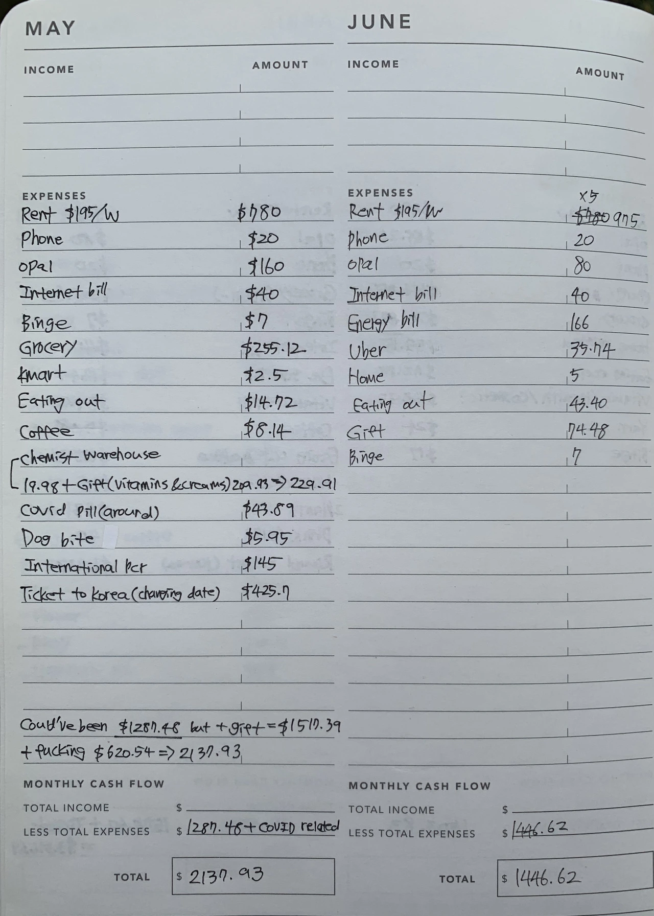 그래서 올해 9개월 동안 한국에 다녀온 티켓 비용과 놀고먹고 쓴 650만 원 비용을 제외하고 호주에서의 생활비만을 봤을 때 한 달 생활비는 대략 $1800 (170만 원) 정도가 평균이다. 200 넘게 쓴 게 절반이긴 한데 가장 적게 쓴 달은 한국에 내내 있다 돌아온 6월을 제외하고 $1503.83 인 3월인데, 어떻게 이렇게 적게 나왔지 싶다. 보니까 취미인 뜨개실도 사고 친구들도 만났고 비타민들도 사고 TV 구독료도 냈는데? 생활비를 아낄 마음이 없으니 굳이 이유도 찾지 않는다. 하하.