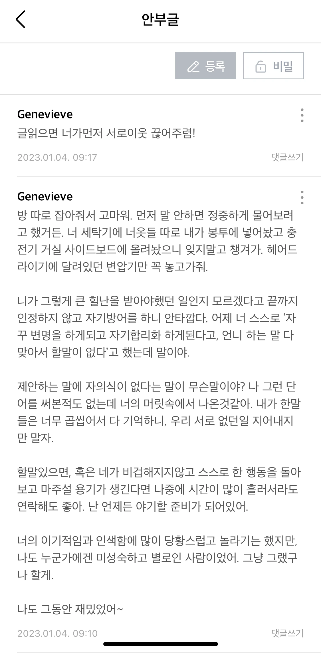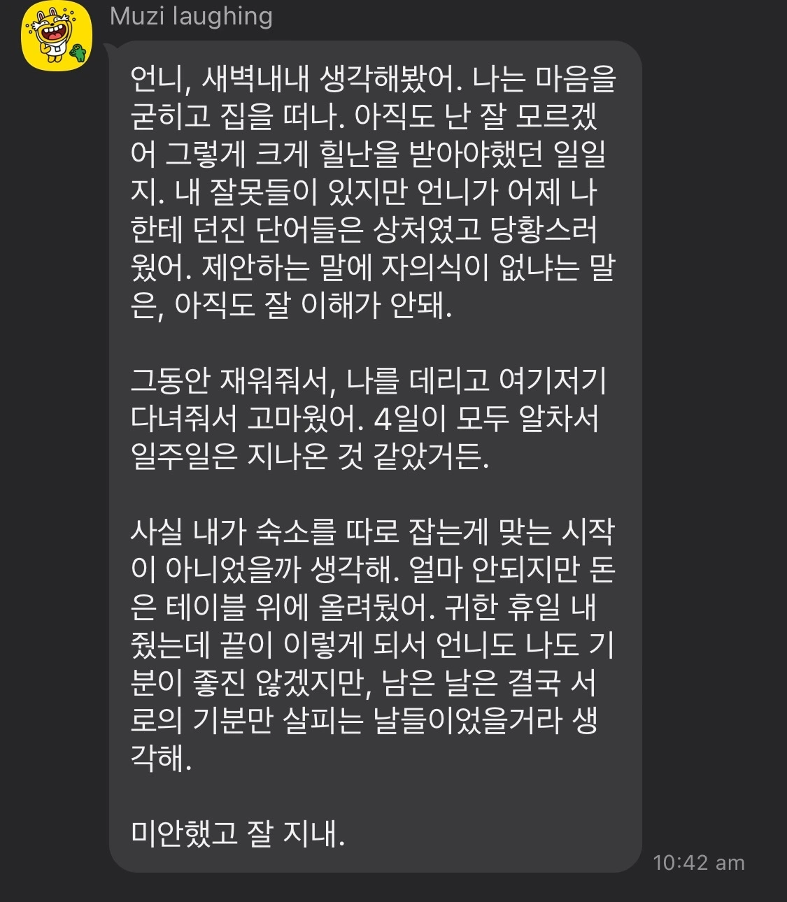 너와 대화하는 시간은 즐거웠고 너에게서 배운 점도 꽤 있어. 어제 너한테 말했듯이, 나도 미성숙하고 이기적으로 행동한 날들이 있었어. 근데, 인정하는 게 첫걸음이야. 그냥 많이 안타까웠어. 너는 생각보다도 더 자기 방어가 강한 사람이라 아마 영원히 회피하며, 내가 이해 안 가는 사람이라 생각하며 살겠지. 내가 잘 지내라고 해도 너의 마음이나 정신적인 부분들은 잘 지내지 못할 것 같네.