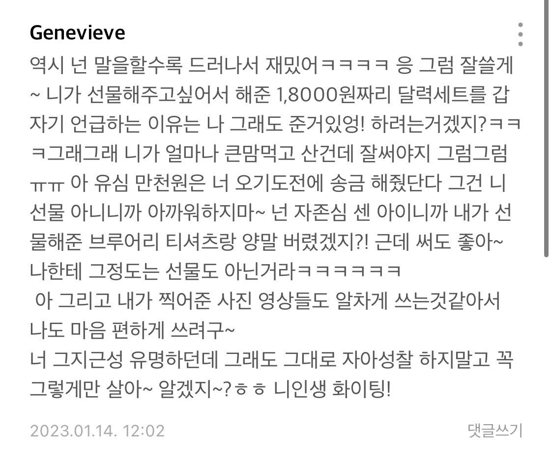 다른 친구의 말을 빌려 정말 상거지와 다름없었던, 빈대같이 빌붙었던 친구야, 사일 간 너와의 경험은 나에게 정말 큰 깨달음을 주었어. 너는 평생 네가 잘못한 것이 아니라고, 너는 잘못한 것이 하나도 없고 내가 이상한 사람이라고 믿으며 살아가겠지만, 나는 네가 평생을 그렇게 믿으며 살아가고 또 많이 데여보았으면 좋겠어. 네가 잘 살던 못 살던 내 알 바가 아니지만 분명 너는 다른 사람들을 더 잃을 것임을 확신한단다. 앞으로는 또 귀찮게 말 걸지 않았으면 좋겠어. 이번에 정말 신사적으로 착하게 타일러 준 정도였지만 그때는 좋은 말로 끝나지 않을 거란다.
