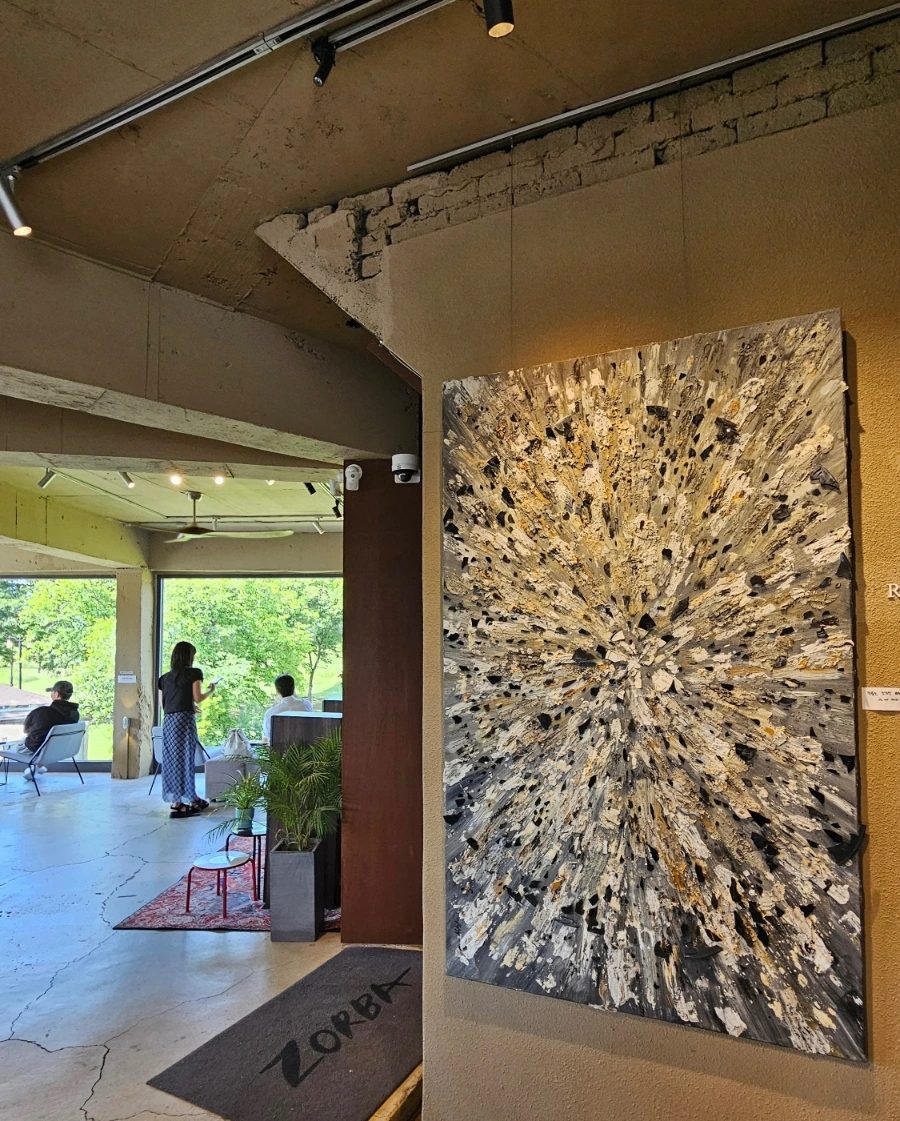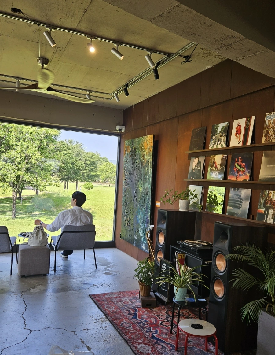 유화물감을 겹겹이 짓이겨 완성한 것 같은 그림에 바이닐 스피커존까지