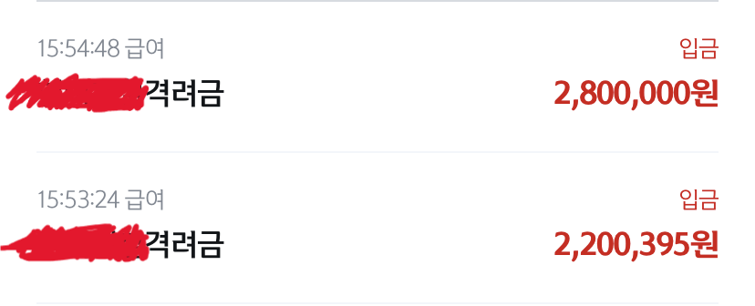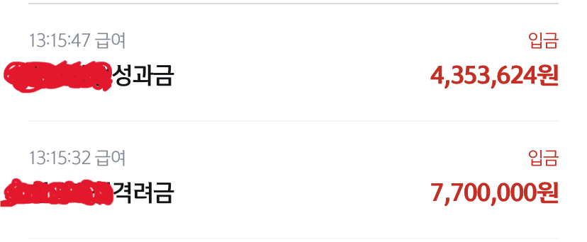 적지도 많지도 않은 평범(?)한 성과급을 지급하는 회사임을 감안하고 봐주시길 바라며, 아래에 공개되는 모든 성과급은 급여계좌로 입금된 금액이므로 세후 금액임을 밝힌다. (사실 세후든 아니든 모든 직장인은 연말정산에서 1년 치의 소득을 모두 더한 후에 세액을 결정하기 때문에 큰 의미는 없다.)