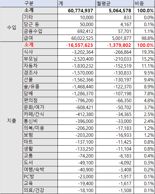 - 수입 : 60,774,937원 (월평균 5,064,578원)