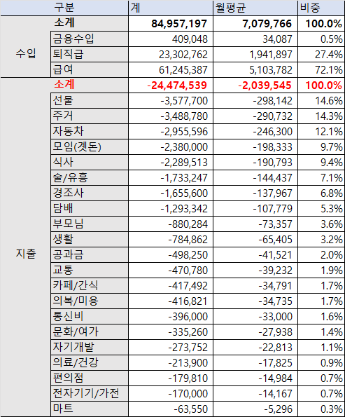 - 수입 - 지출 : 44,217,314 (월평균 3,684,776원)