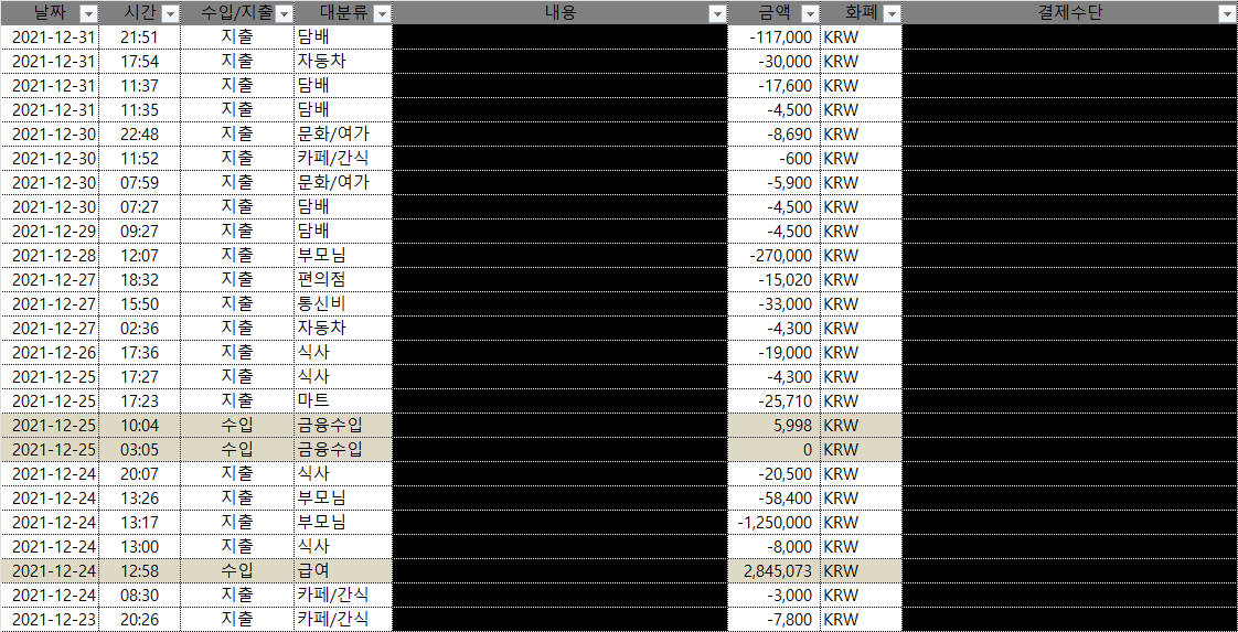 필자는 가계부 어플로 뱅크샐러드를 사용하고 있으며, 기록된 데이터를 엑셀 파일로 다운로드하여 가계부 내역을 정리하고 있다. 가계부를 제대로 작성한 지는 2년 정도 되었다.