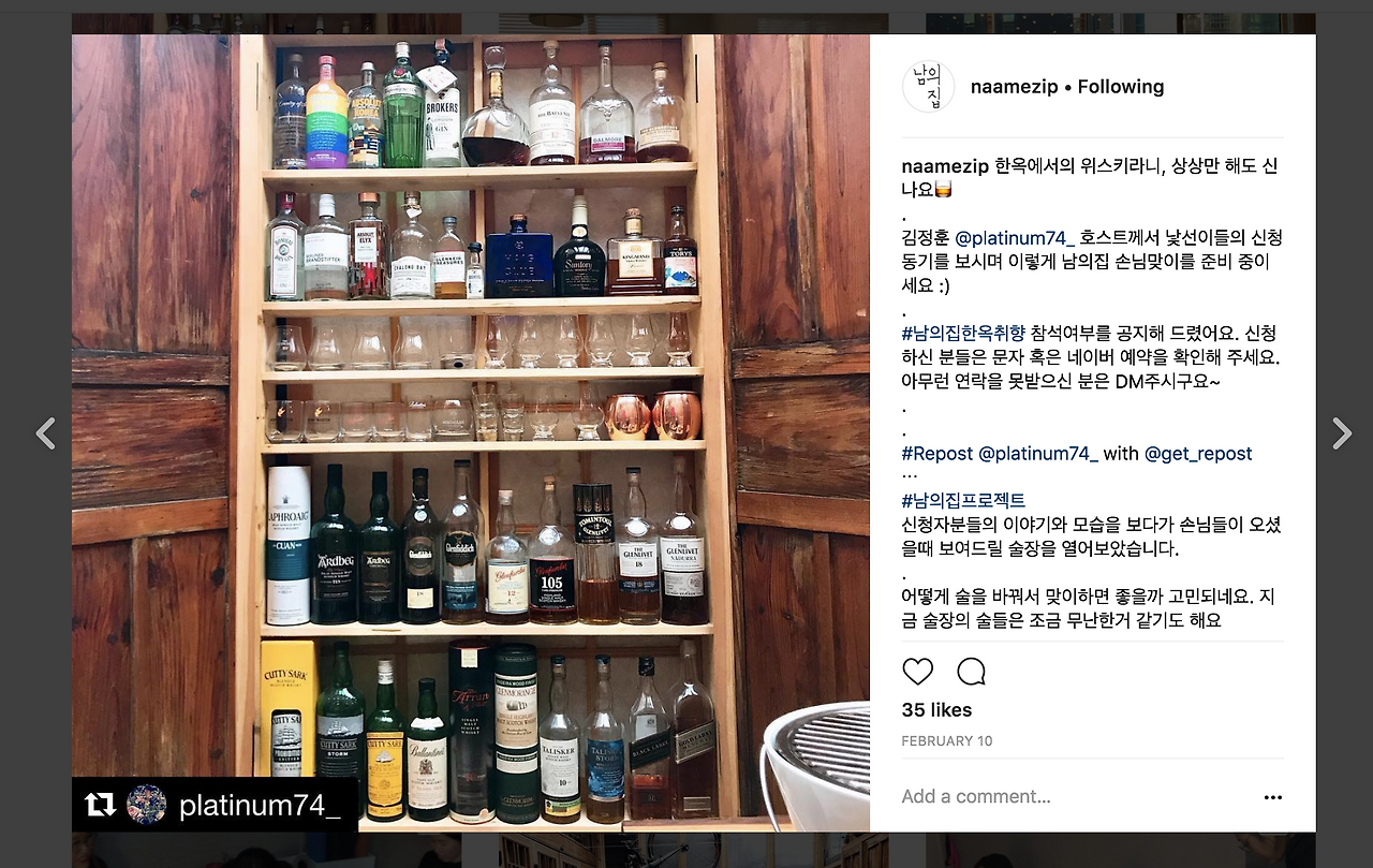'남의 집 프로젝트'는 집주인이 주거공간과 취향, 삶을 나눌 수 있도록 자리를 마련해준다. 남의 집 피드에서 내 취향이 나오기만을 호시탐탐 살펴보고 있다가 '한옥' 그리고 '위스키 장'이라는 두 키워드에 끌려 고민할 틈도 없이 신청서를 작성했다.