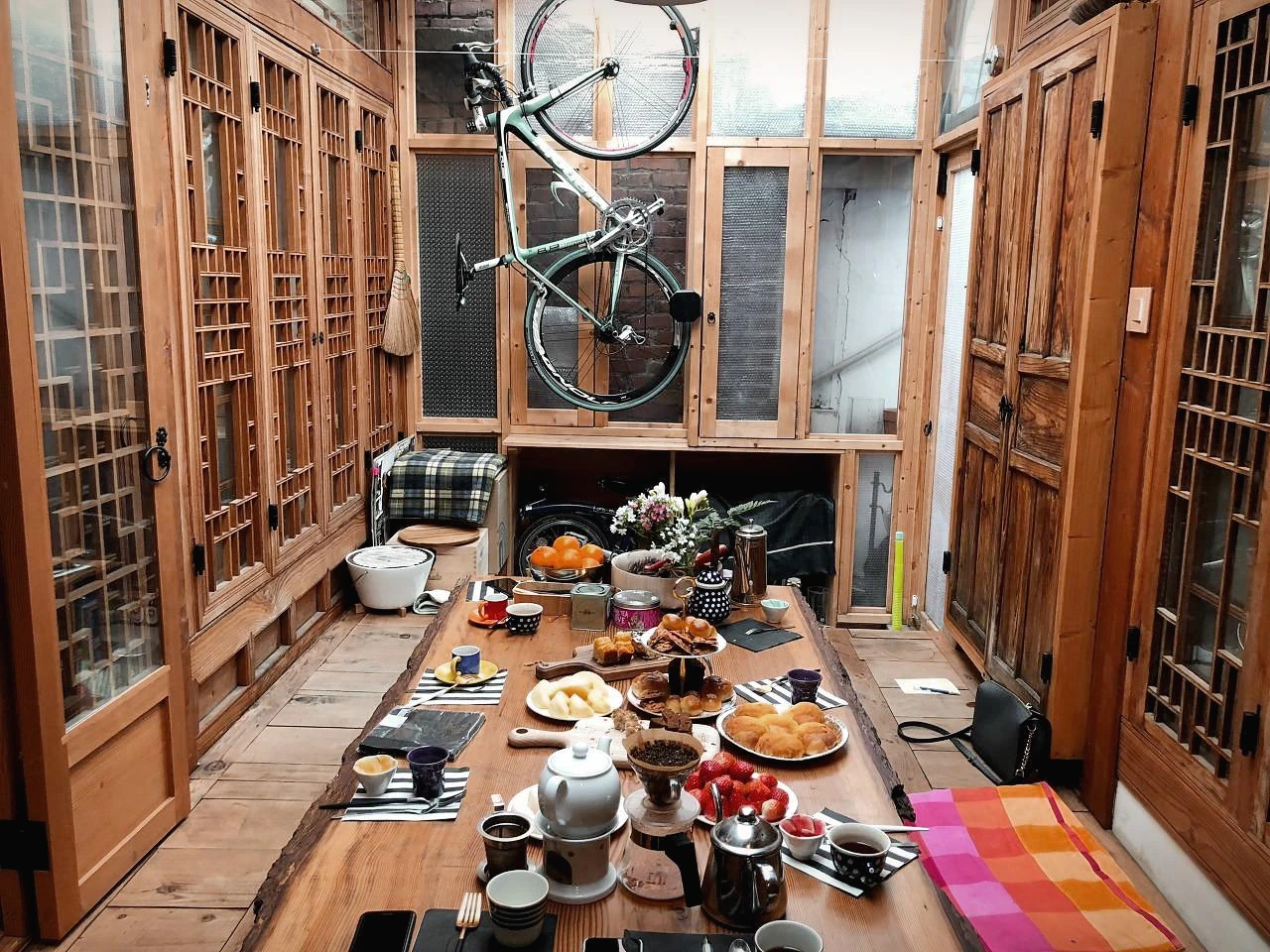 안내글 중 초인종이 없으니 문을 두드리거나 '이리오너라'를 외쳐달라는 내용이 있었다. 막상 남의 집 앞에 서니 두드리면서 '이리오너라'를 외칠 엄두가 나지 않아 기웃거렸다. 열리지 않을 것 같던 대문이 갑자기 열렸고 시원하게 펼쳐진 마당공간과 그 가운데 크게 자리한 원목 테이블이 시선을 끌었다.
