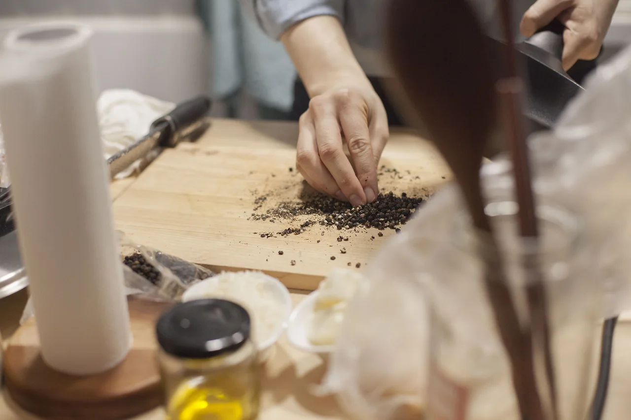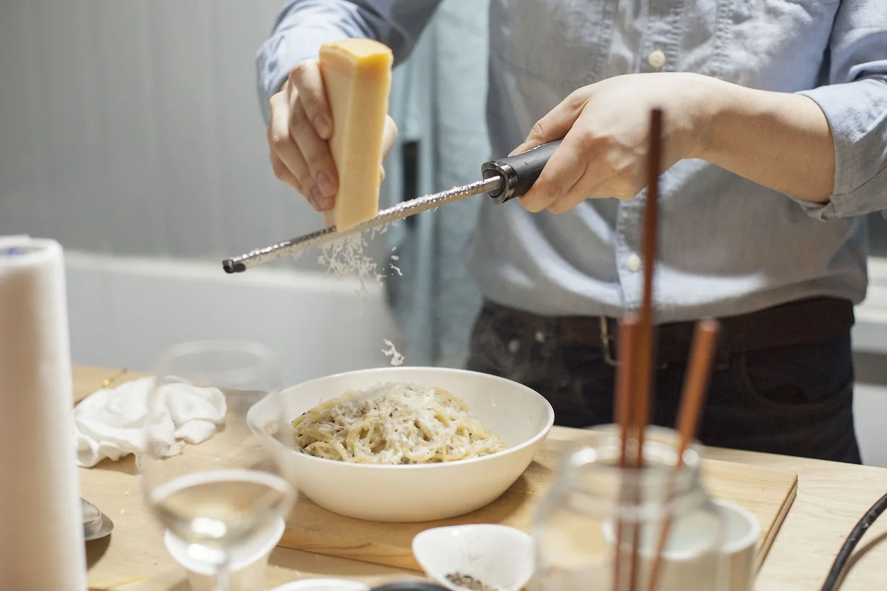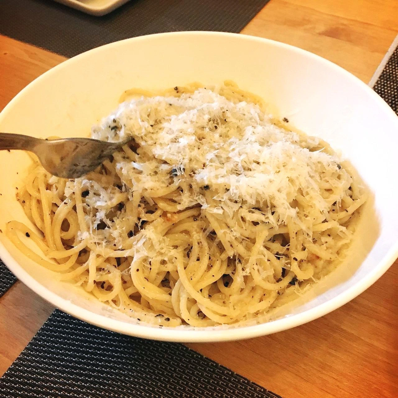 원준이는 인도에서 친구가 사다 줬다는 흑 통후추를 사정없이 으깨기 시작했다. 그리고 따뜻한 파스타 면에 버터를 넣어 잘 녹아들게끔 저어주었다. 화룡점정으로 짭로롬한 하드 치즈를 아낌없이 갈아줬다.