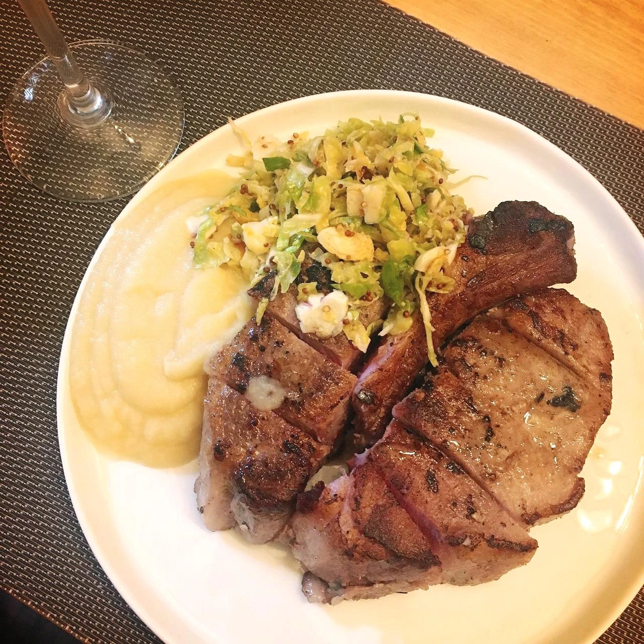 뼈 등심 구이와 사과소스 그리고 브뤼셀 스프라우트 샐러드