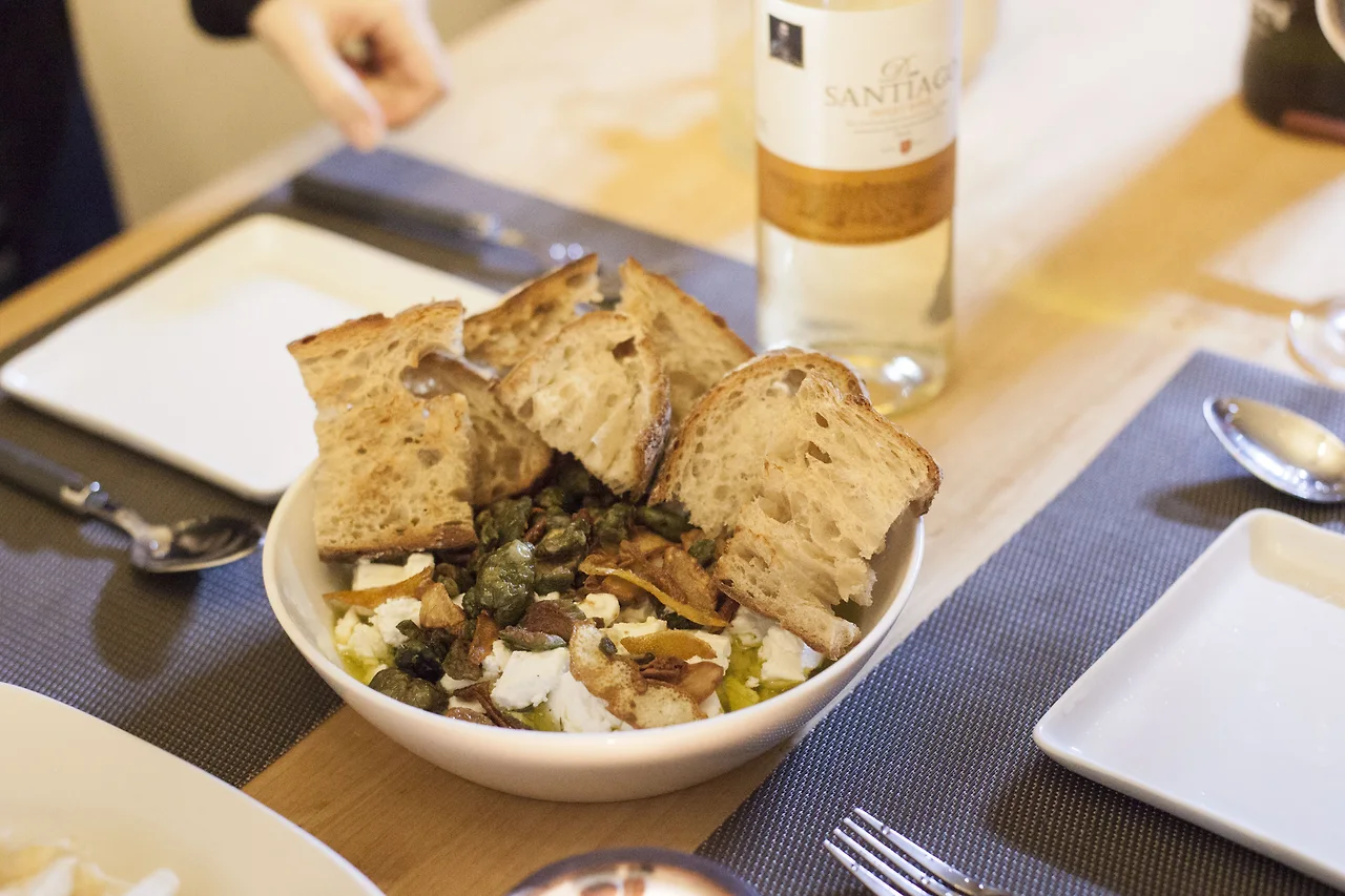 : 페타치즈를 적당한 크기로 부시고, 그 위에 레몬 껍질, 마늘 등으로 라미네이드한 올리브를 뿌린다. 그리고 살짝 팬에 구운 샤워도우 빵을 곁들이는 요리.