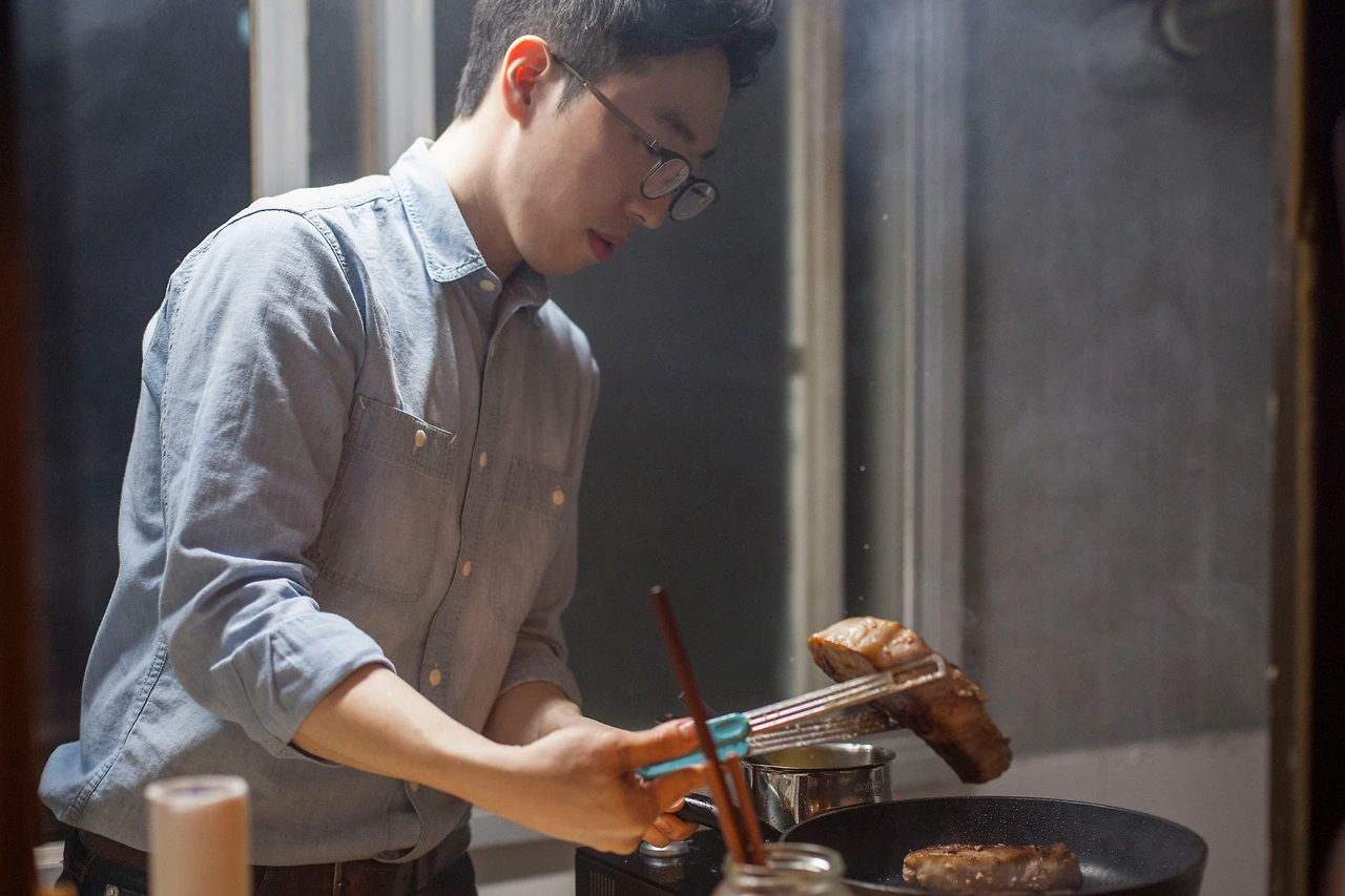 건대의 어느 옥탑방에 있는 오픈 키친. 진구네 식탁은 여러 로망의 요소를 가진 곳이었다. 요리하는 이와 마주 보며 대화를 할 수 있는 공간 구조였고, 작은 공간에 가득 찬 4인용 식탁이 더 집중하게끔 만들었다. 원준은 막 도착한 우리에게 웰컴 드링크를 만들어주었다.