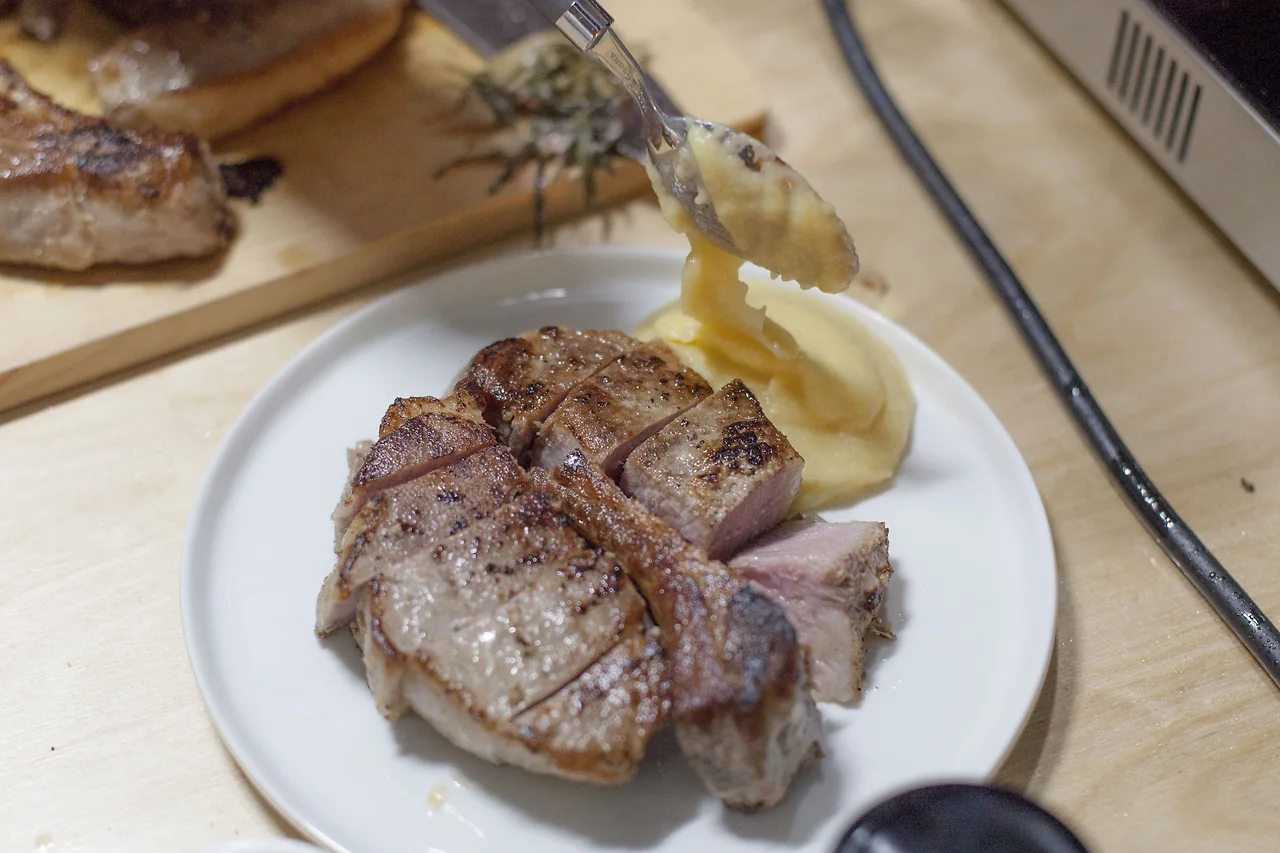 : 로즈마리와 함께 수비드 한 뼈 등심을 꺼내 겉표면이 바삭해지도록 버터와 함께 구워준다. 먹기 좋은 크기로 잘라 갈변되지 않도록 사과식초와 함께 만든 사과소스를 얹고, 미니 양배추로 만든 가니쉬를 곁들인 요리.