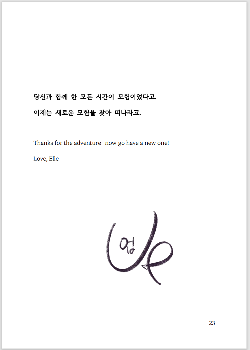 신혼 때부터 집안 곳곳 앨리의 손이 닿지 않은 곳이 없었다. 둘만의 보금자리를 한순간에 버린다는 것은 칼에게 매우 고통스러운 일이었을 것이다. 이곳으로 떠나 오기 전, 아등바등 집을 지키기 위해 칼은 얼마나 모진 사람이었던가. 부부가 함께한 약속을 지키지도 못하고 무심히 흘러버린 시간 앞에서 얼마나 회한이 들었을까? 앨리가 잠시 머물다 간 공간의 기운이라도 날마다 느끼지 않으면 혼자 남은 이 세상이 너무도 원망스러웠을 것 같았다.