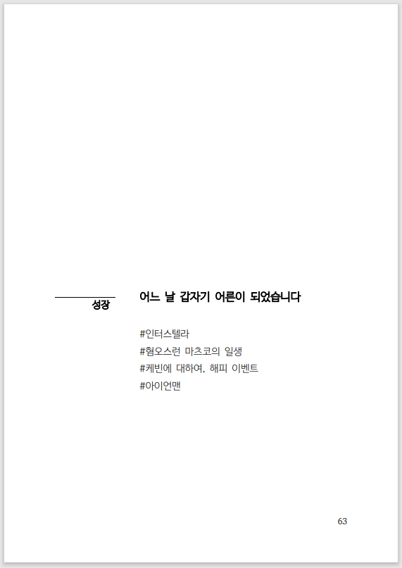 우리는 언제부터 어른이 되는 것일까? 학생의 신분일 때는 하루빨리 성년이 되고 싶었다. 그런데 막상 성인이 되어 나에게 생긴 변화는 없었다. 귀찮은 일은 여전히 귀찮았고, 하고 싶지 않은 일은 여전히 하고 싶지 않았다. 작은 일 하나에도 여러 고민에 빠지고 걱정이 많은 성향은 어른이 되어도 크게 달라지지 않았다.