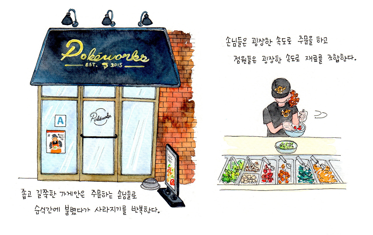 몇 달 전쯤, 미용실에서 잡지를 뒤적이다가 우연히 포케 웍스에 관한 기사를 읽게 됐다. 포케는 회를 샐러드나 밥 등과 함께 얹어먹는 음식으로 하와이에서 유래했는데 뉴욕에서 급속하게 확산되고 있다는 내용이었다. 설명이 꽤 자세해서 글을 읽는 동안 회덮밥과 비슷한 형태와 맛이 머릿속에 그려졌다.