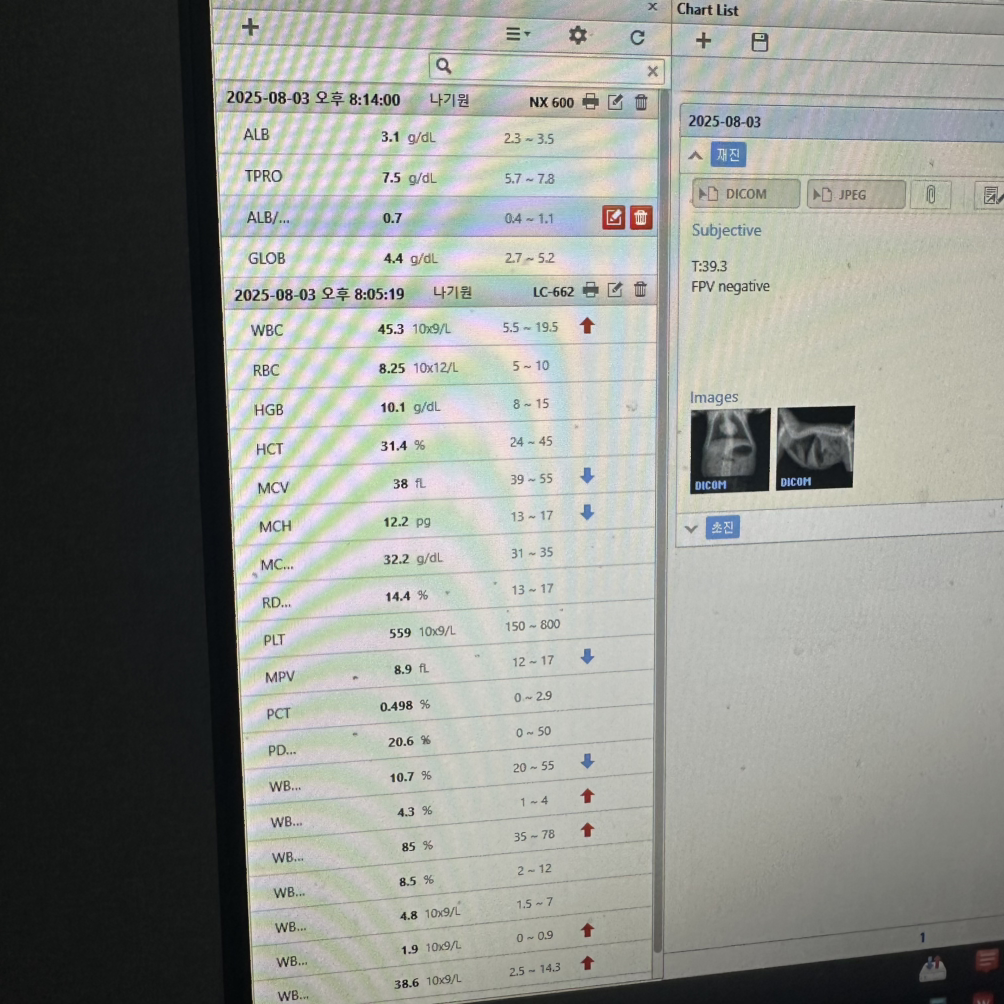 초음파, 엑스레이, 혈액 검사, 그리고 치명적인 파보 바이러스 검사까지. 다행히 파보는 음성이었지만, 혈액 검사 결과 백혈구 수치가 비정상적으로 높게 나왔습니다.