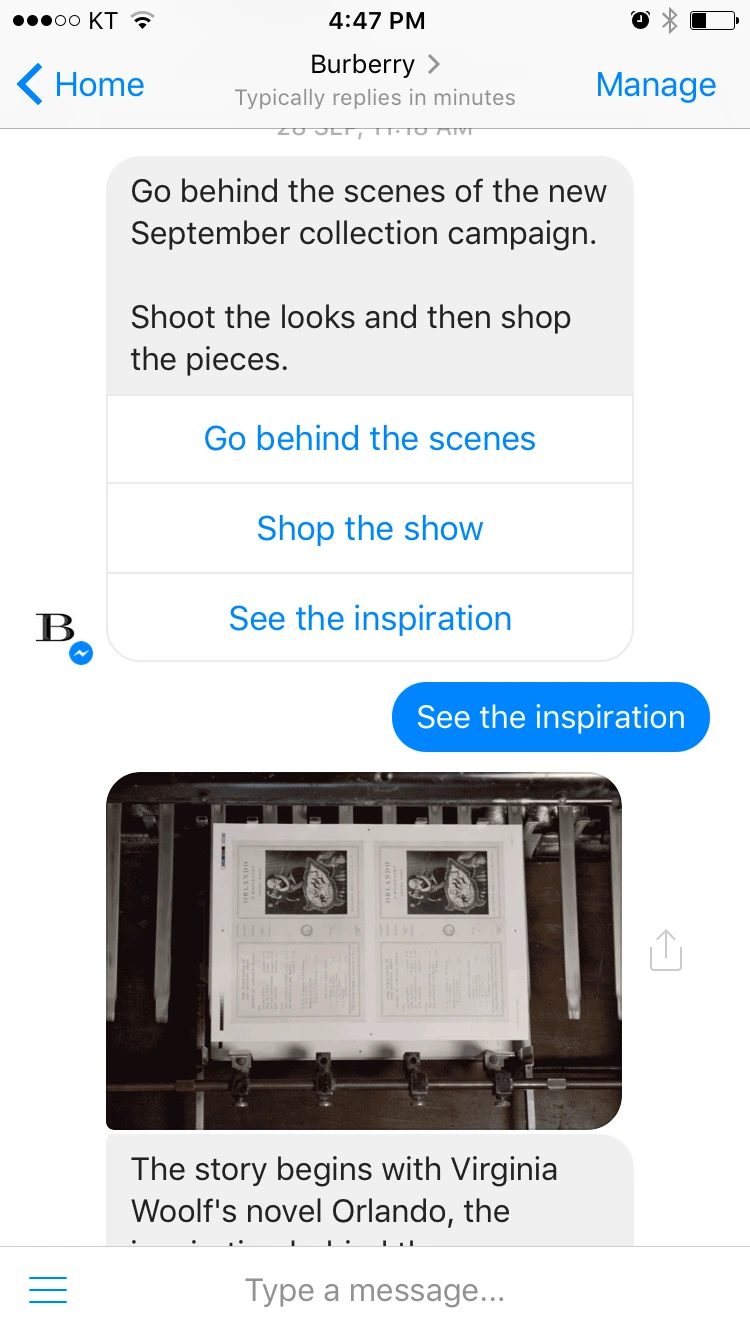 버버리가 2016 London Fashion week을 하면서, 패션쇼의 뒷 이야기를 페이스북 메신저창에서 이야기하며 Gif 애니매이션을 포함한 다양한 이미지와 제품을 보여주고, 실제로 구매도 할 수 있도록 프로모션용으로 챗봇을 활용했다. 단기 프로모션용으로 활용한 사례로, 이미지가 좋으니 대화경험도 좋아보인다.