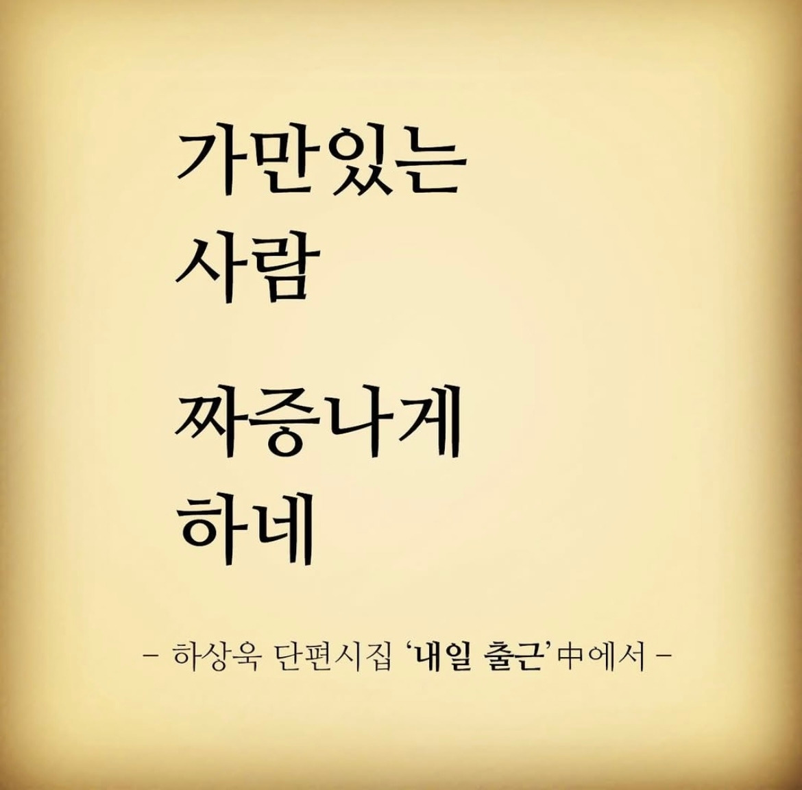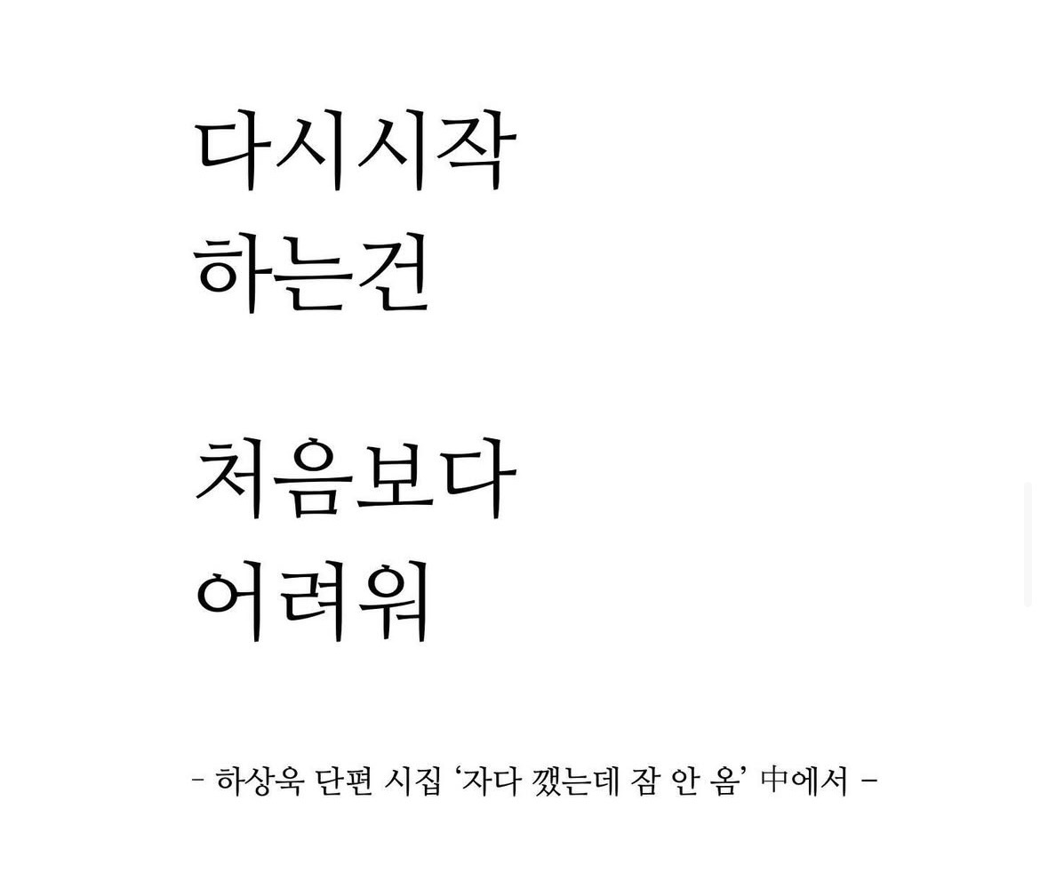 시 문학의 발전에 기여했다고 감히 말한다. 하상욱 작가 쓴 시의 특징은 내용이 먼저 나오고 제목을 마지막에 보여준다. 마지막 제목을 보고 나면 아! 맞아 맞아. 공감을 하게 된다. 제목을 가리고 맞춰보는 재미도 있다.