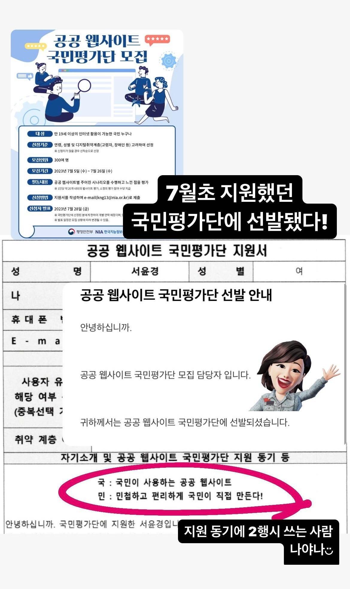 첫 문장을 어떤 말로 시작할지 애매한 경우에 슬로건처럼 삼행시로 시작하면 많은 지원 동기 중에 눈에 띌 수 있을 것이다. 이 때문인지는 모르겠지만 실제 선발이 되어 국민평가단 수행을 했다.