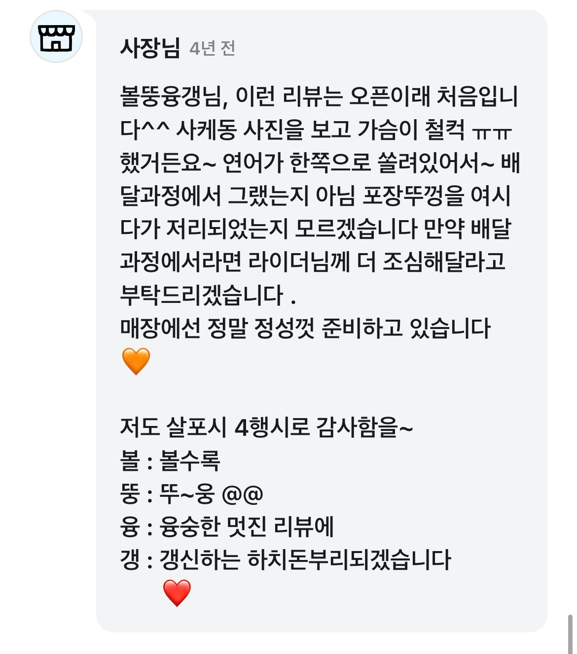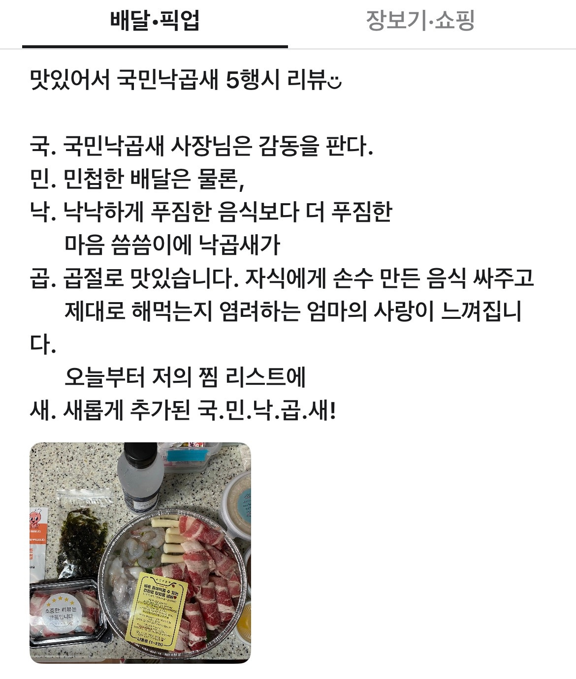 배달음식을 시켜 먹었는데 너무 맛있어서 삼행시로 후기를 남겼다. 감동한 사장님은 내 닉네임으로 사행시 댓글을 써주셨다. 이에 재미가 들린 나는 만족스러운 음식일 경우, 메뉴명이나 가게 이름으로 삼행시 리뷰를 쓴다.
