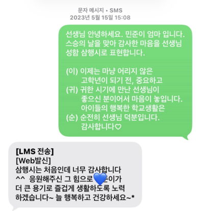 스승의 날 아이의 반대표 학부모로부터 선생님께 감사 문자 보내기 이벤트 소식을 들었다. 감사한 마음과 읽는 재미도 드리고 싶어서 '스승의 날' 사행시에 마음을 담아 보냈다.