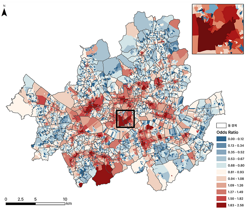 전반적으로 서울의 중심부에서 붉게 나타나고 서울의 외곽지역에서 푸르게 나타나는 경향을 확인할 수 있었습니다. 서울대학교가 위치한 관악구 남동부 지점은 이례적으로 붉게 나타나네요.
