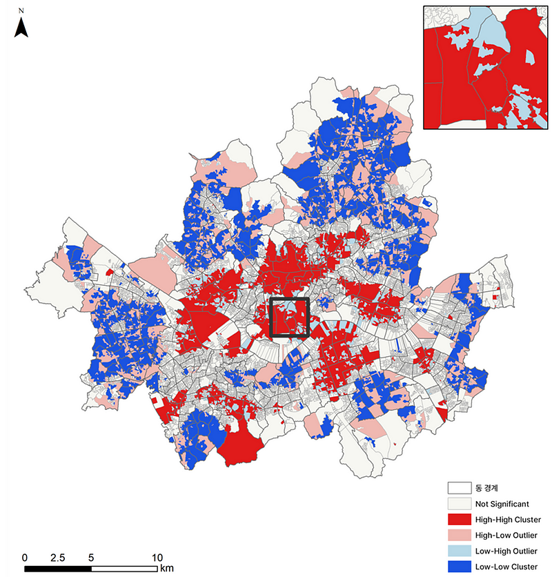 군집 탐지를 위해 국지적 공간적 상관관계를 확인할 수 있는 지표인 Local Moran’s I 분석을 진행했습니다.
