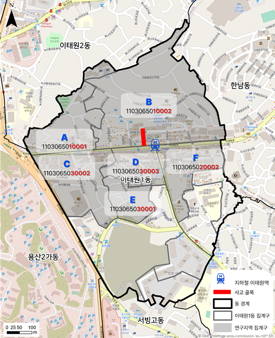 생활인구 데이터를 활용한 분석의 연구지역은 이태원 1동의 10001번 집계구, 10002번 집계구, 20002번 집계구, 30001번 집계구, 30002번 집계구, 30003번 집계구로 선정했습니다.