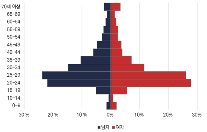 한편 10세 미만 아동보다, 10-14세 초등학교 고학년 ~ 중학교 저학년 연령대 인구가 더 적었습니다.