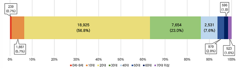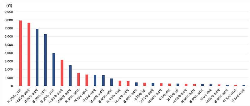 남녀를 불문하고 20대가 가장 많았고, 그 다음으로 30대가 많은 것으로 보입니다.