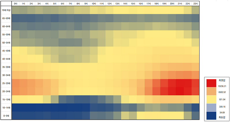 외국인을 제외한 한국인만 대상으로 하며 분석한 결과입니다. 가로축은 시간대를, 세로축은 연령대를 나타냅니다.