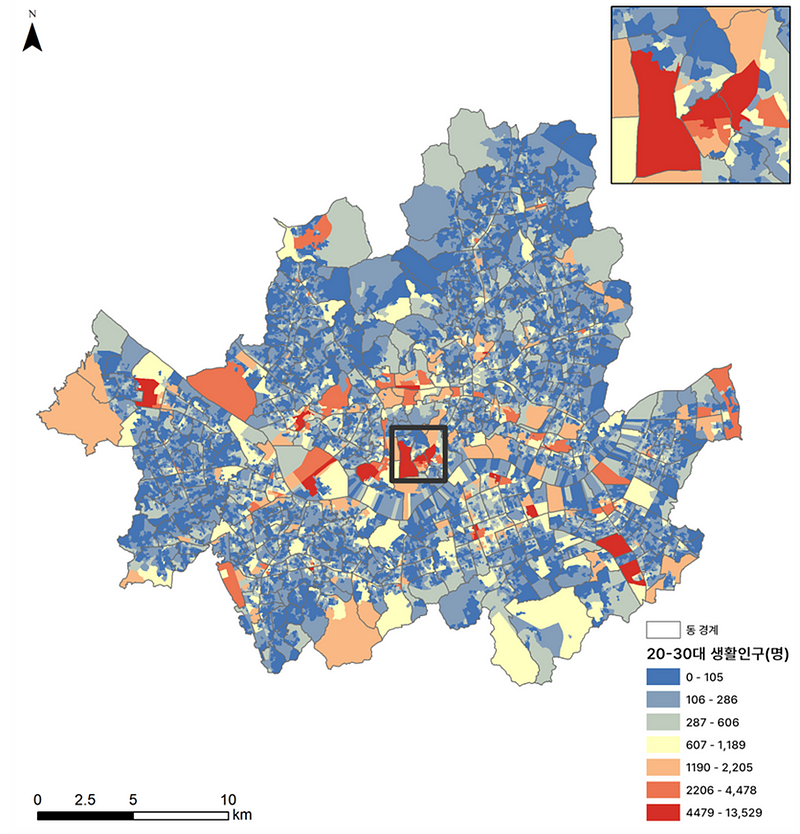 한편, 모든 연령대 생활인구 중에서 2030이 차지하는 정도를 집계구별로도 확인해볼 수 있습니다.