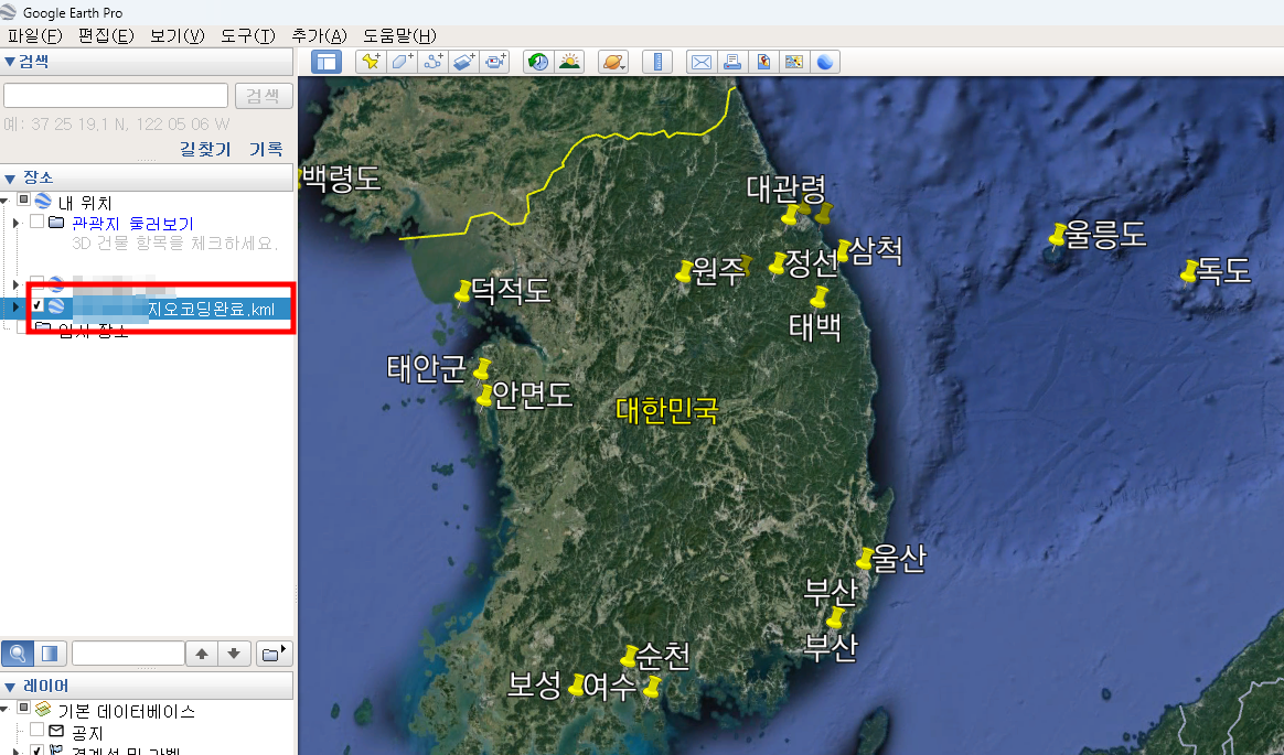 kml 확장자를 이용하여 구글어스 위에 나타낸 결과