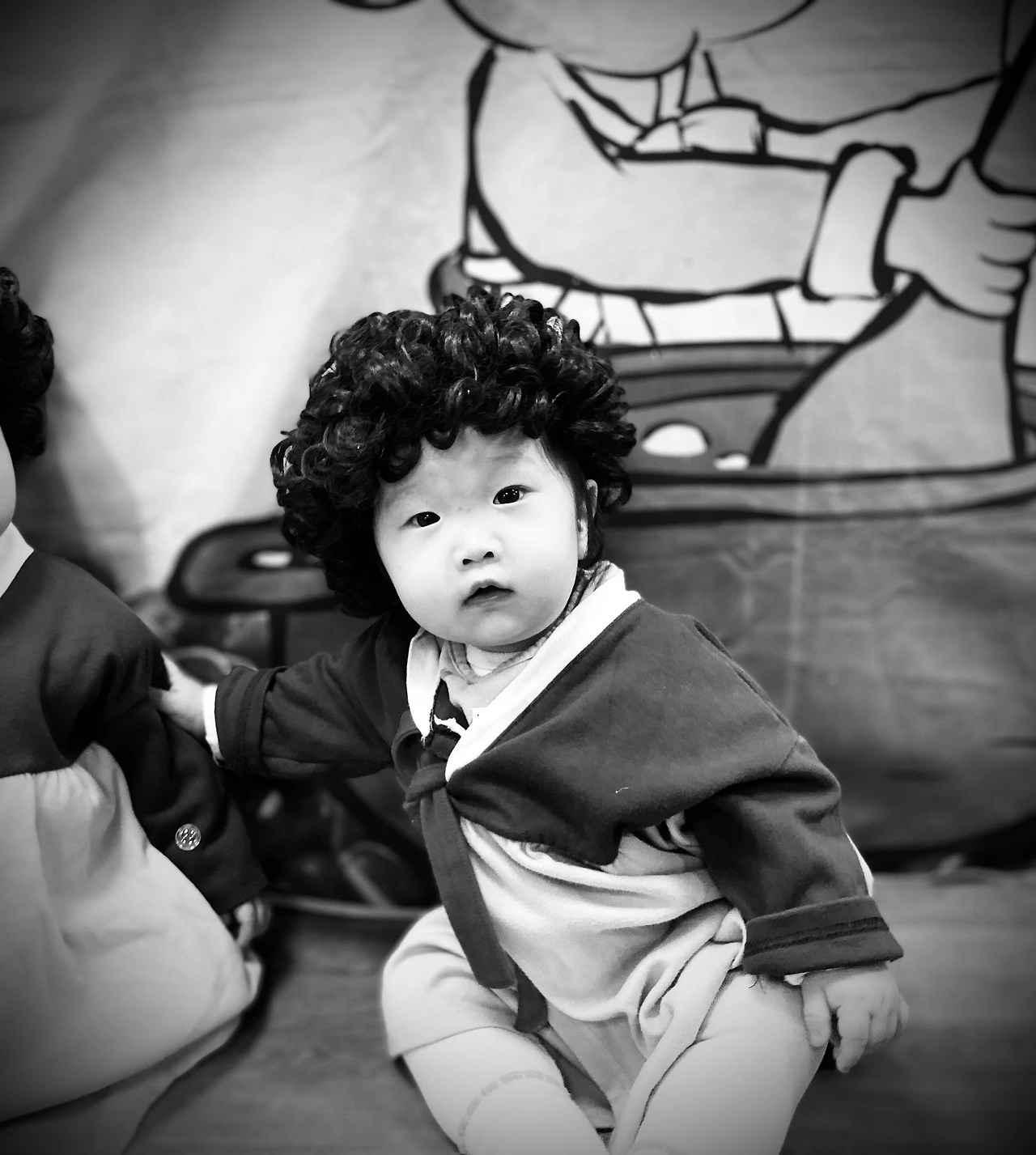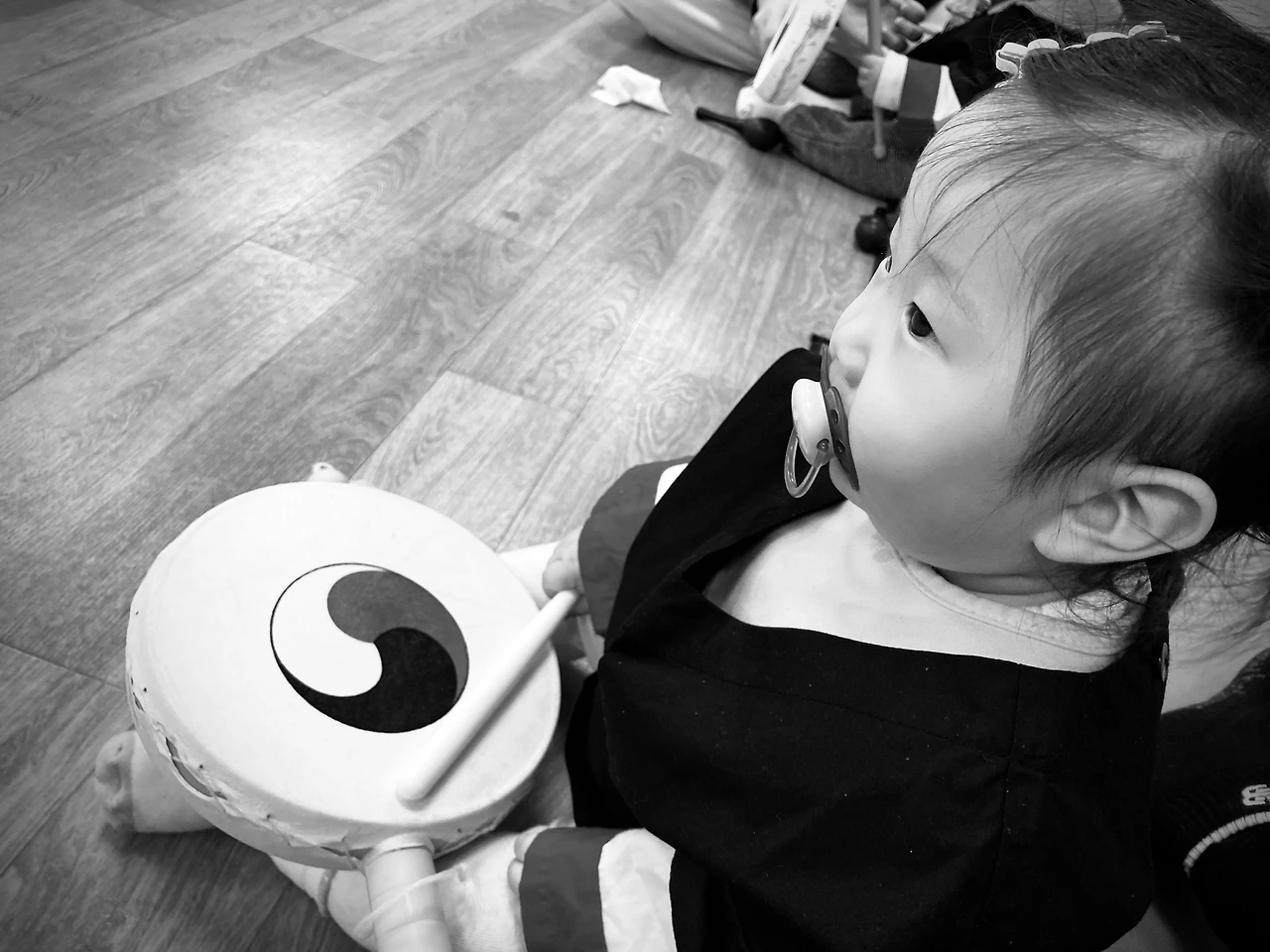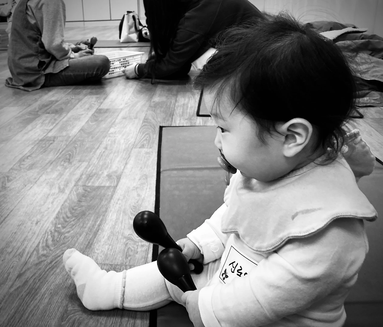 8명의 영유아가 참여하는 수업 첫날, 로아를 제외하고는 모두 엄마들이 동행했다. 이것만으로도 이 할아버지의 로아 수업 동행은 내게도 특별한 느낌을 주었다. 한 아기의 할머니도 엄마와 함께 오시긴 했지만 참여는 못했다. 교실 밖 통로에서 문에 난 작은 창을 통해 까치발로 손주의 모습을 교실 밖에서 연신 지켜봐야만 했다. 한 명의 보호자만 아기와 함께 있을 수 있기 때문이었다. 안과 밖, 그 차이가 이렇게 크게 느껴지는 경우도 많지 않겠다는 생각에 미안한 마음과 특별한 마음이 동시에 들었다.