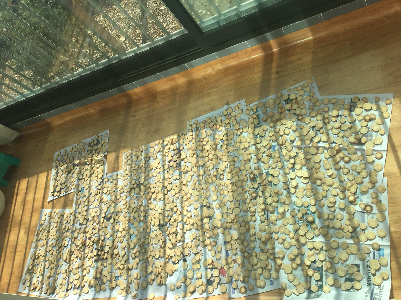 2. 잘라서 말린다. 이층에는 겨울 햇빛이 약하고 머무는 시간이 짧기 때문에 가능한 얇게 썰었다.