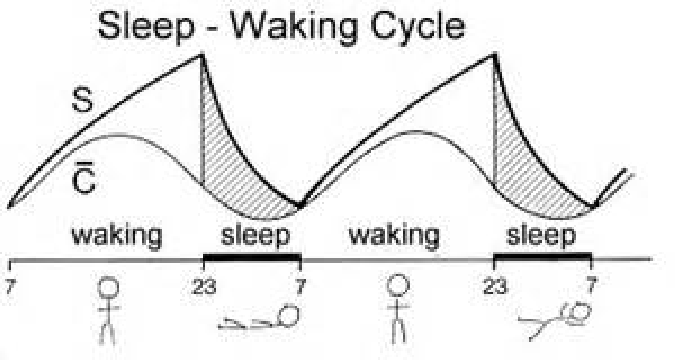 이 두 가지를 함께 생각해보자. 잠에서 깨어난 이후 s 회로의 활동에 의해 수면의 요구는 계속 점진적으로 증가한다. 그리고 C회로는 낮에 정점을 찍은 후 밤이 되면서 점차 활동도가 낮아진다. 이 두 가지를 종합하면 밤이 되었을 때 c회로의 각성도가 낮아지고 s회로에 의한 피로도도 증가하면서 수면을 취하게 되고, 수면을 취하면서 s 회로로 인해 쌓인 아데노신은 없어지게 되는 것이다.