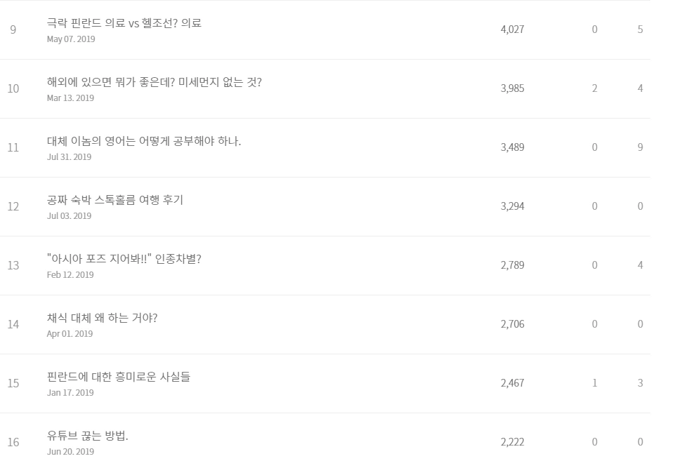 많은 사람들이 보는 글을 쓴다는 기분도 좋았지만, 무엇보다 글 쓸 거리를 찾는 것이 어렵지 않았다. 매일이 새로웠고, 글을 쓸 주제는 언제나 메모장에 쌓여 있었고, 주제들을 실로 엮어 하나의 글로 만들어 낼 의지도 활활 타오르고 있었다. 위의 통계를 살펴보면 주로 처음 6개월 간 작성한 글이다. 여름에 터키에 갔을 때 역시 새로운 환경이기에 글을 쓸 거리가 많았고, 조회수 역시 제법 높게 나왔다. 그러나 문제는 다시 핀란드로 돌아왔을 때부터 시작되었다.