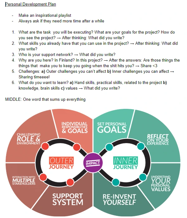 외국에서 온 봉사자들을 위해 자신이 원하는 것을 구체적으로 작성하면서 스스로를 돌아보는 시간을 가지게 하는 시간이다. 진행을 담당했지만, 봉사자들과 함께 작성해보는 것이 좋겠다고 생각해 나도 스스로 앞으로 핀란드에서 한 달 동안 무엇을 하고 싶은지, 그를 위해 할 수 있는 것이 무엇이 있는지 등을 고민했다. 고민이 그리 길어지기 전, 핀란드를 떠나기 전 이 경험을 가시화해서 기록으로 남기고 싶다는 결론에 도달했다.