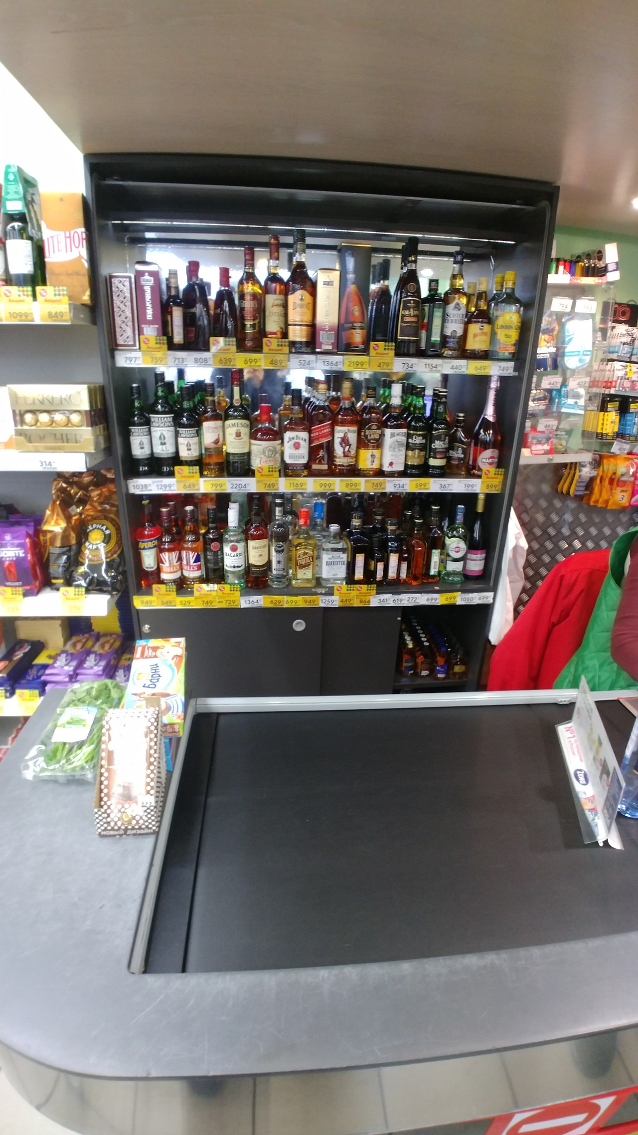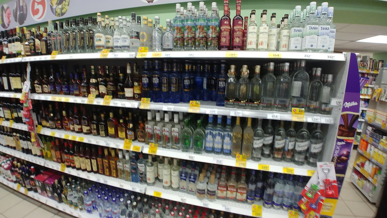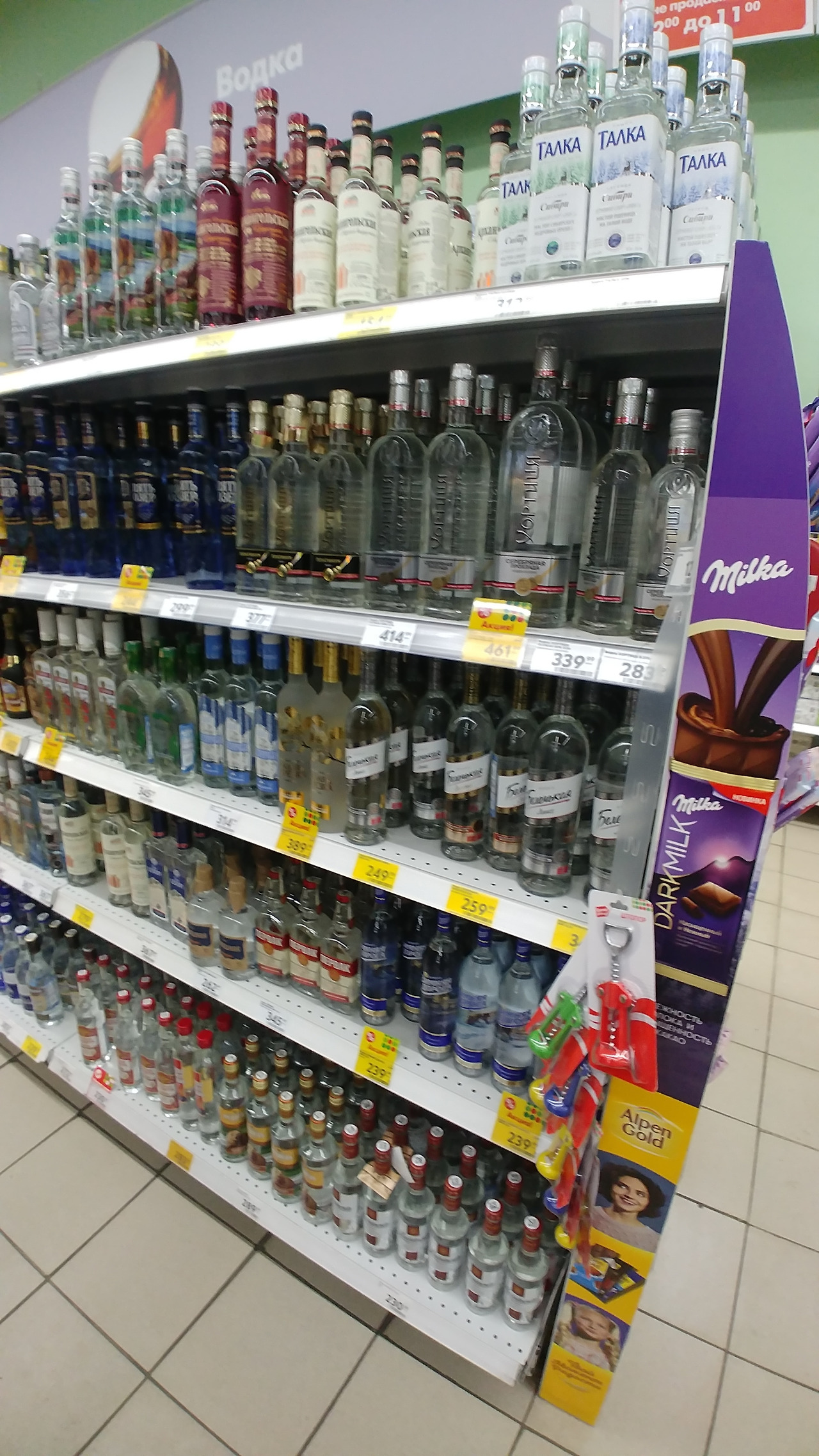 마트의 계산대 옆에는 보통 사람들이 마지막으로 보면서 쉽게 추가할 수 있는 제품들이 주로 구비되어 있다. 음료수나 껌, 사탕 등이 대부분이다. 그러나 러시아에서는? 껌, 어림도 없지 당연 술이다. 아주 높은 도수의 술이 마지막 계산대 옆을 장식하고 있다.