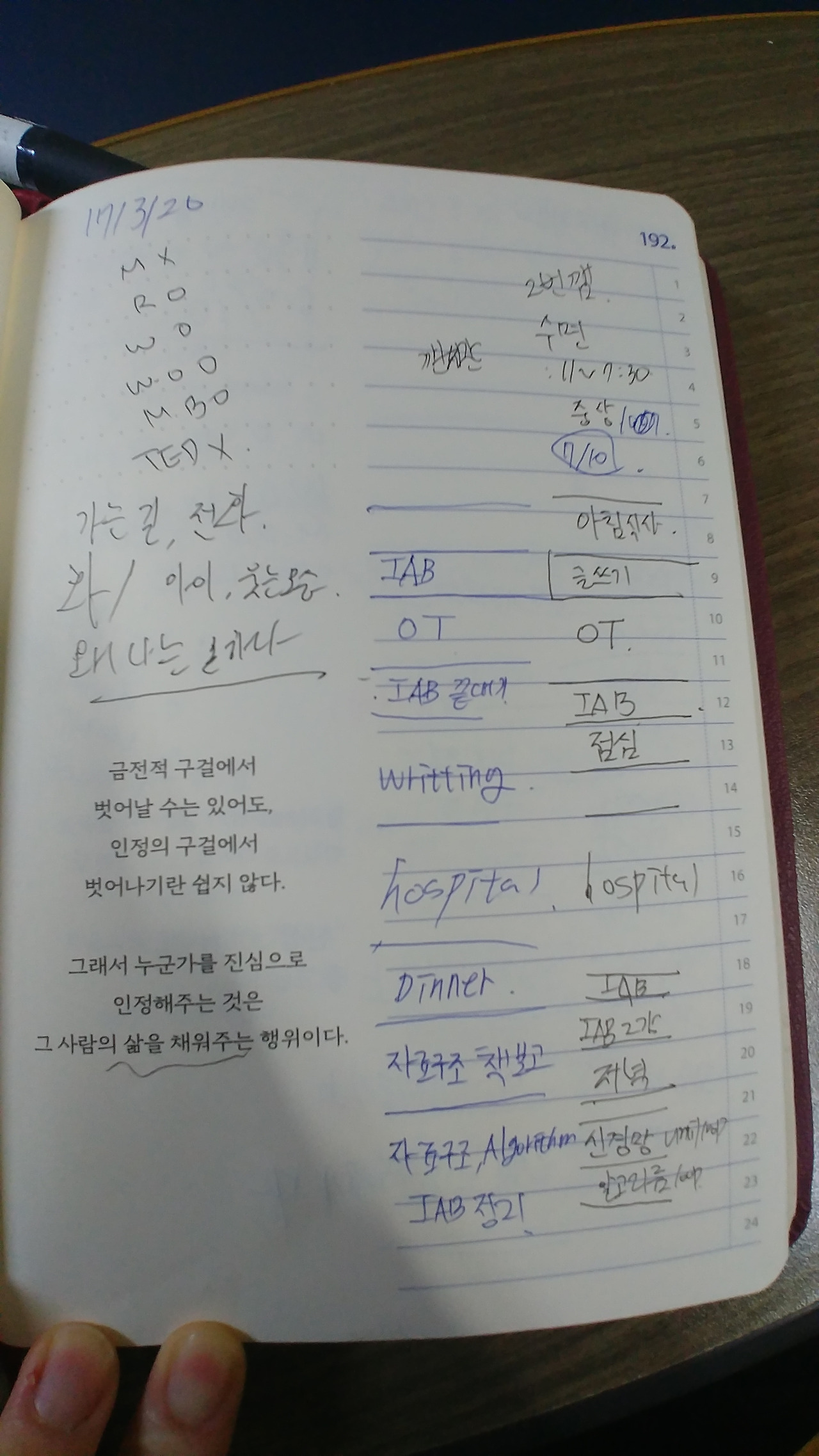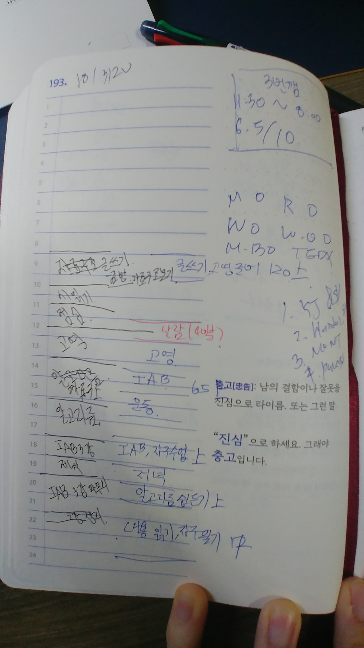 이럴 때 유용하게 쓰일 수 있는 방법이 바로 매일 다이어리를 작성하는 습관이다. 더 많은 자유를 누리기 위해서는 철저한 자기 관리가 필수다. 내게 요즘 가장 소중한 일은 이 다이어리를 통해 내 생활을 놓치지 않는 것이다.