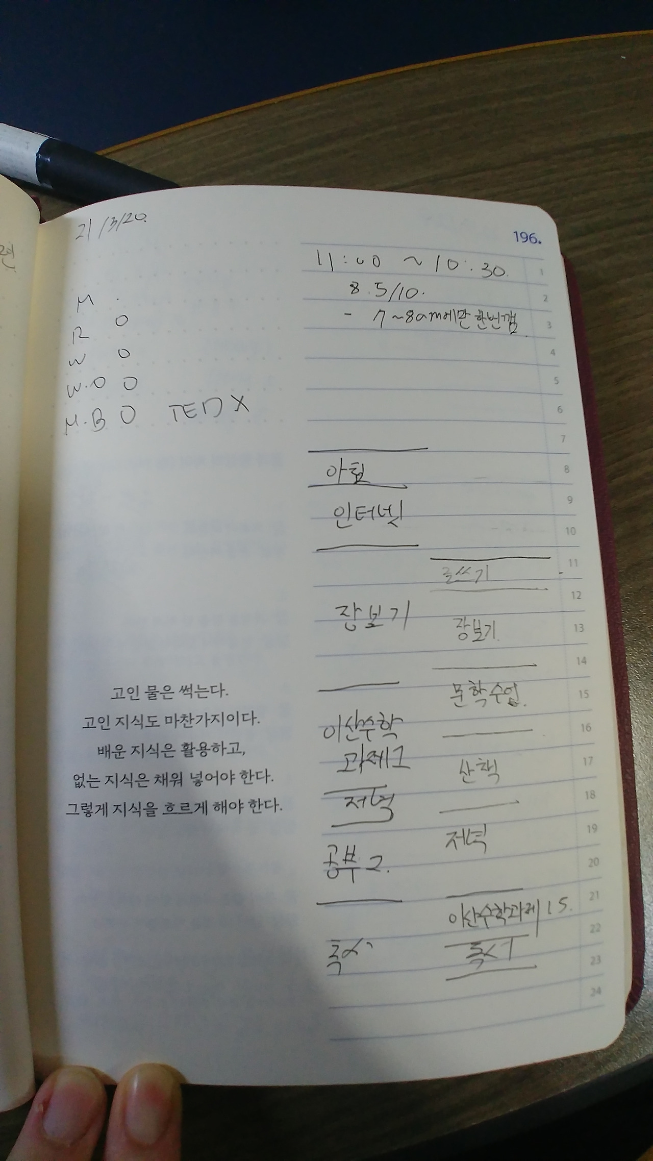 그렇기에 매일매일 하루를 돌아보고, 그때그때 기록하는 습관이 필요하다. 그렇게 1주일이 지났다면 내일을 계획해보자. 매일 내일을 계획하고, 오늘을 반성하는 습관이 형성된다면, 코로나라는 전 세계적인 위기에서 오히려 효율성을 높여 나의 기회로 삼을 수 있을 것이다.