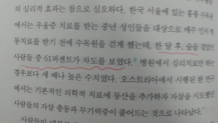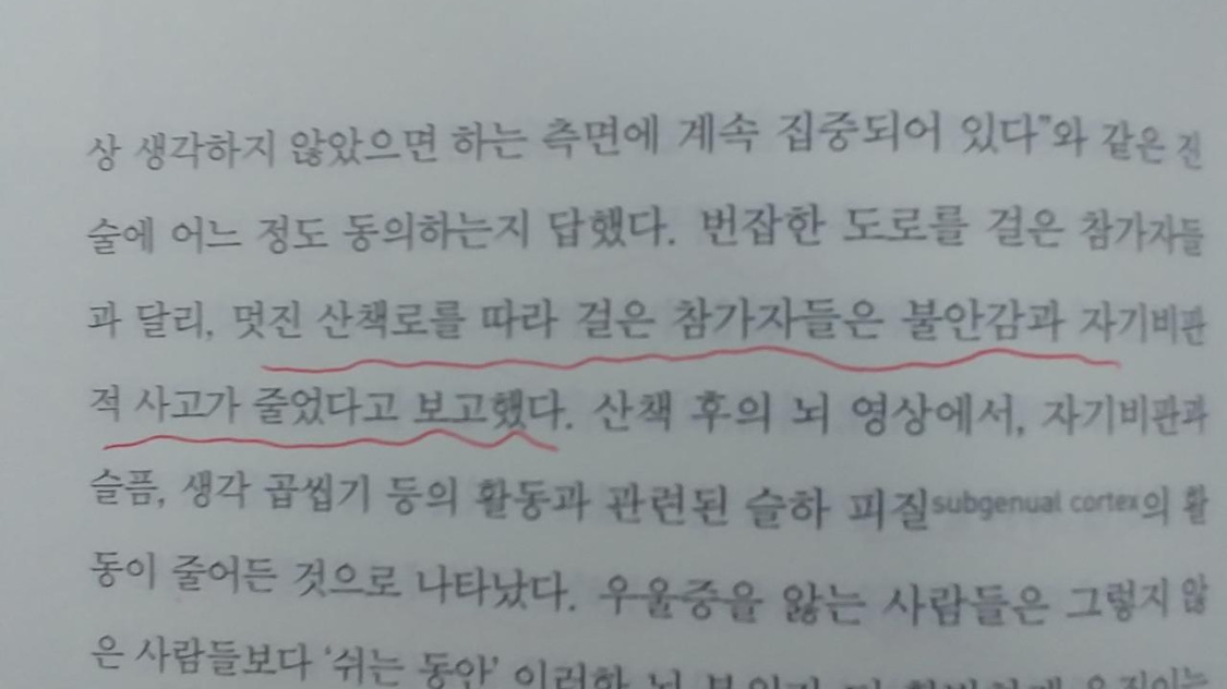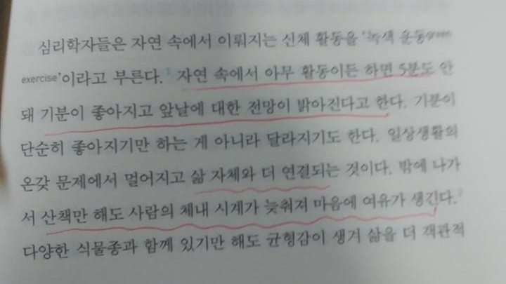 많은 사람들이 자연 속에서 걸었던 것만으로도 심리적으로 차도를 보였으며, 심지어 우울증이 있던 사람들마저 자연 속에서 치유되었다. 지금 일상을 잃어버린 우리 모두에게 필요한 것이다.