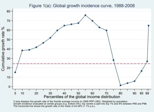 이 집단에 속하는 사람들이 누구인가? 바로 미국, 유럽 등 선진국의 하층민이다. 상위 1%의 사람들은 무려 60%가 넘게 성장한 반면, 상위 20%의 사람은 단 1%만 상승했다. 결과적으로 선진국은 양극화가 더욱 심해졌다.
