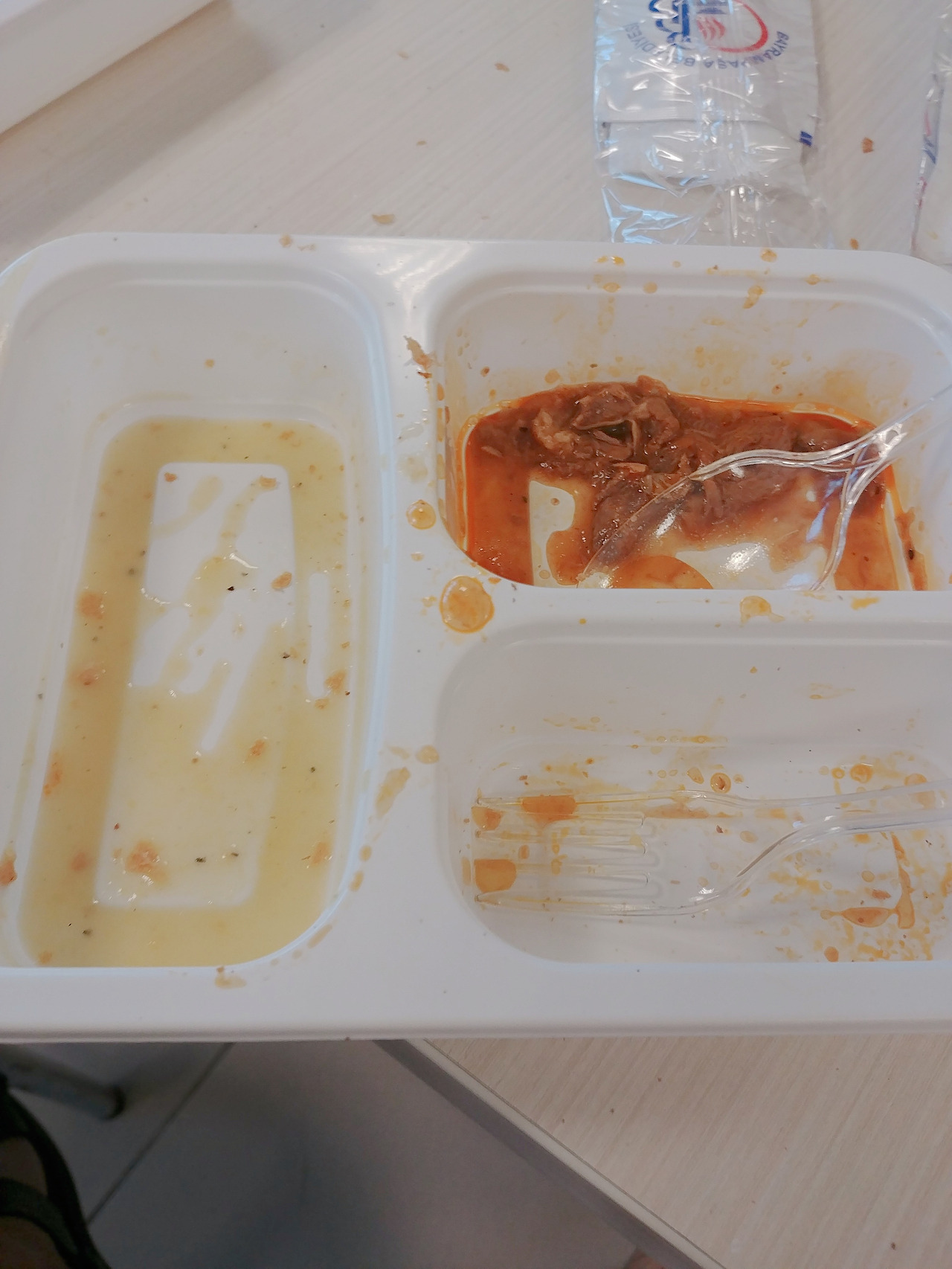 점심 식사를 제공해준다. 당연히 메뉴의 다양성은 없다. 그리고 고기가 들어 있다. 처음에 고기가 들어가 있으니 식사를 건너뛰어야 하나 생각했다. 그러나 배가 너무 고프기 때문에 일단 고기를 제외하고 다 먹었다.